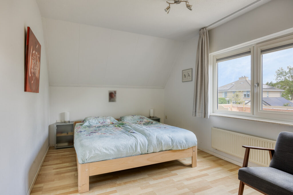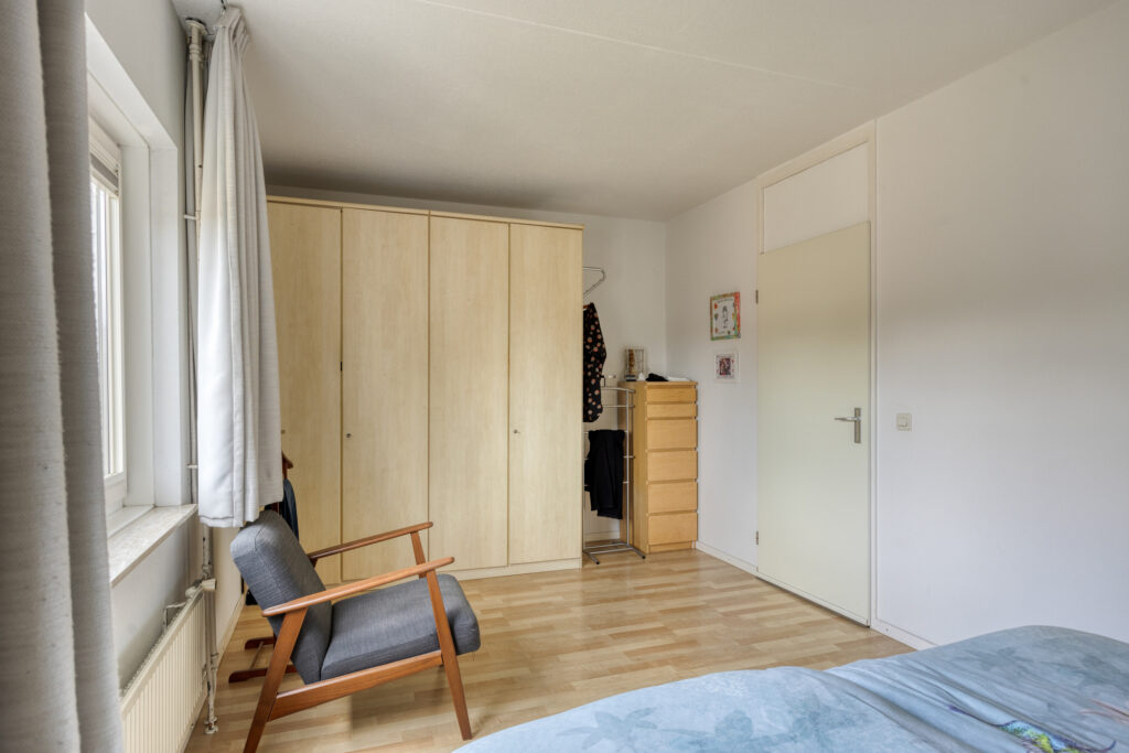 Slaapkamer 1 heeft een oppervlakte van circa 16 m² en is aan de achterzijde gelegen. De raampartij is voorzien van een kunststof kozijn met een draai-/kiepfunctie en ingebouwde verduisterende jaloezieën.