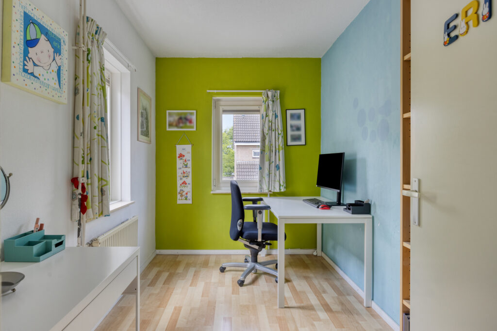 Slaapkamer 3 heeft een oppervlakte van circa 7 m² en is aan de voorzijde gelegen. Ook hier zijn raampartijen met een kunststof kozijn met een draai-/kiepfunctie en ingebouwde verduisterende jaloezieën aanwezig.