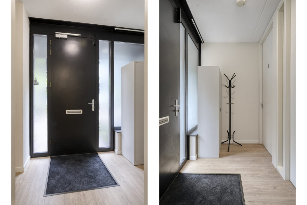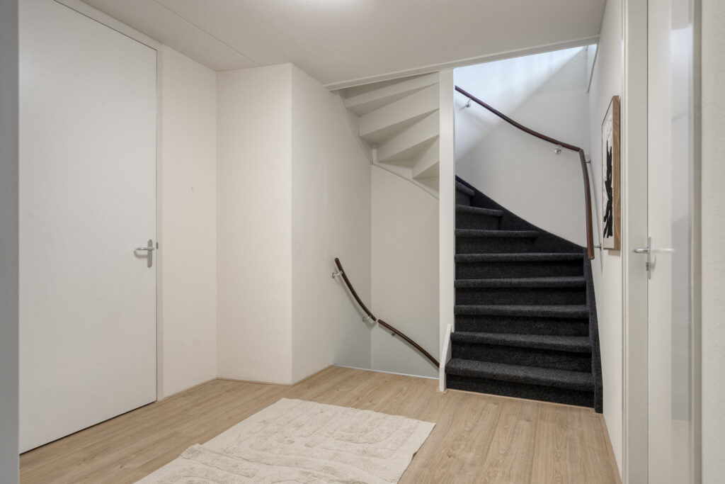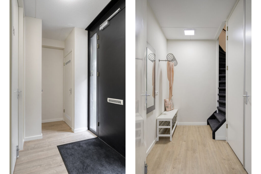 Vanuit het voorportaal is de afsluitbare hal van het appartement te bereiken. Deze ruimte beschikt over veel garderoberuimte, een dubbele vaste kast en de trapopgang naar de eerste verdieping.