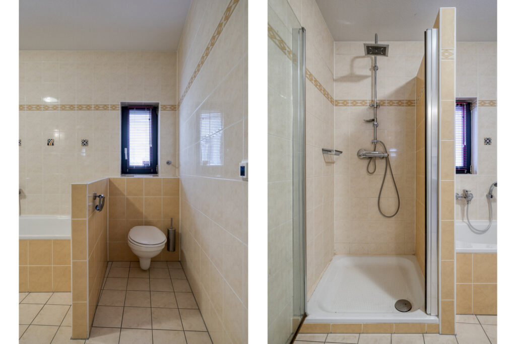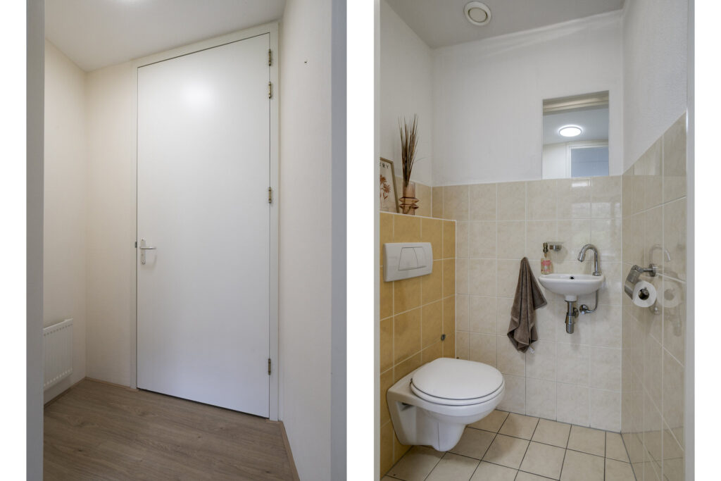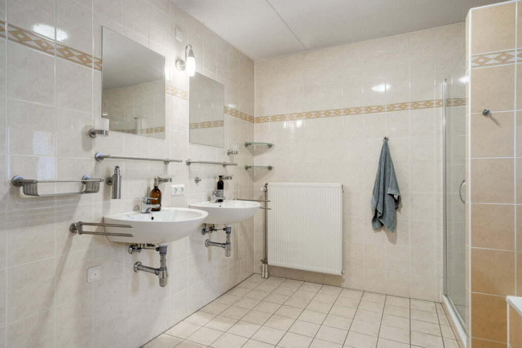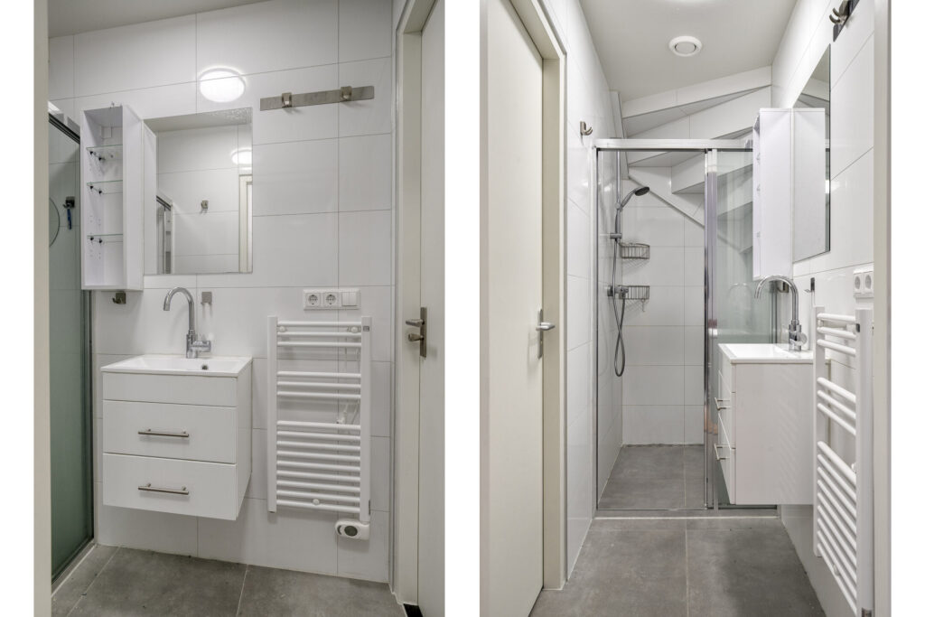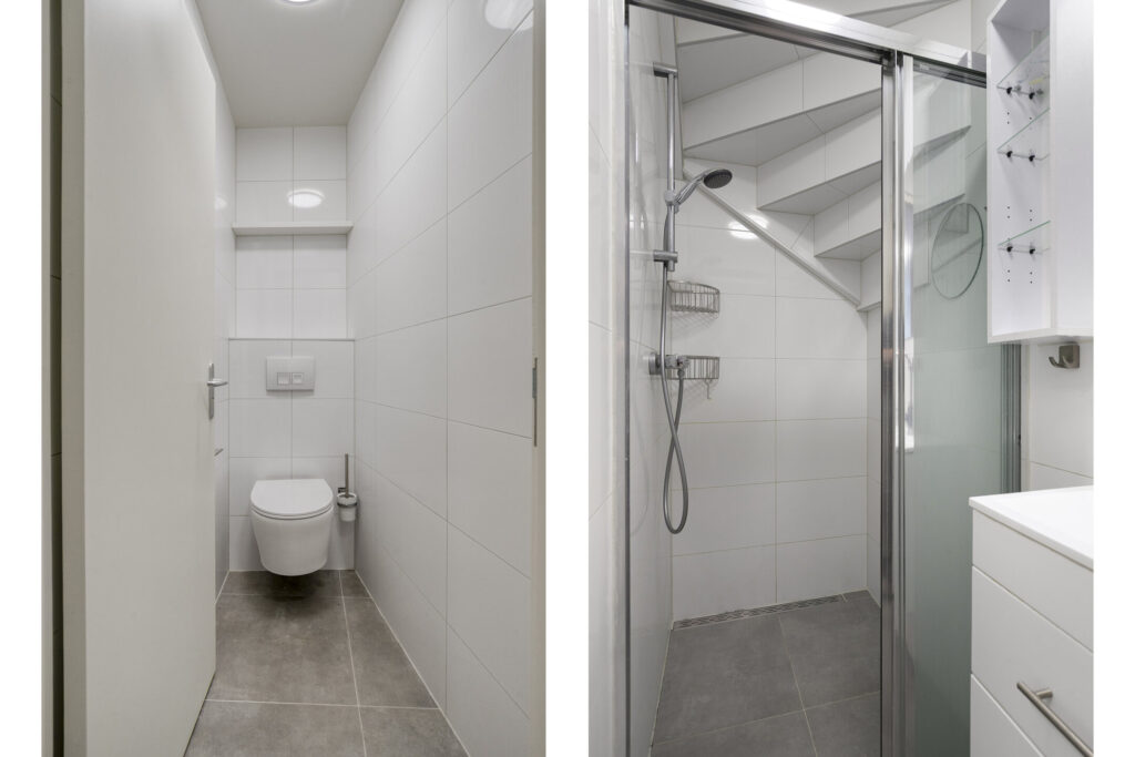 Naast de keuken bevindt zich de badkamer. Deze volledig betegelde ruimte is praktisch ingedeeld met een inloopdouche, een wastafelmeubel en een designradiator. Hier is ook een separate toiletruimte gelegen. De gehele badkamer is afgewerkt met modern tegelwerk in een lichte kleurstelling.