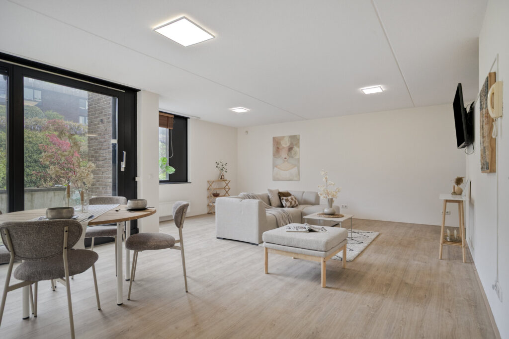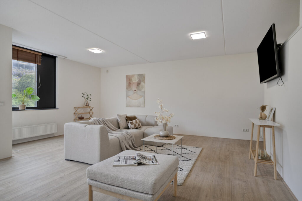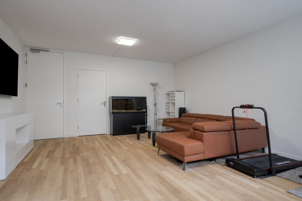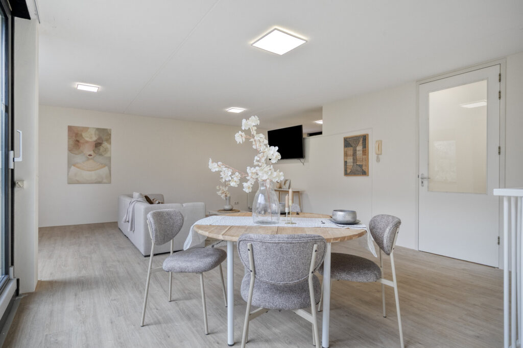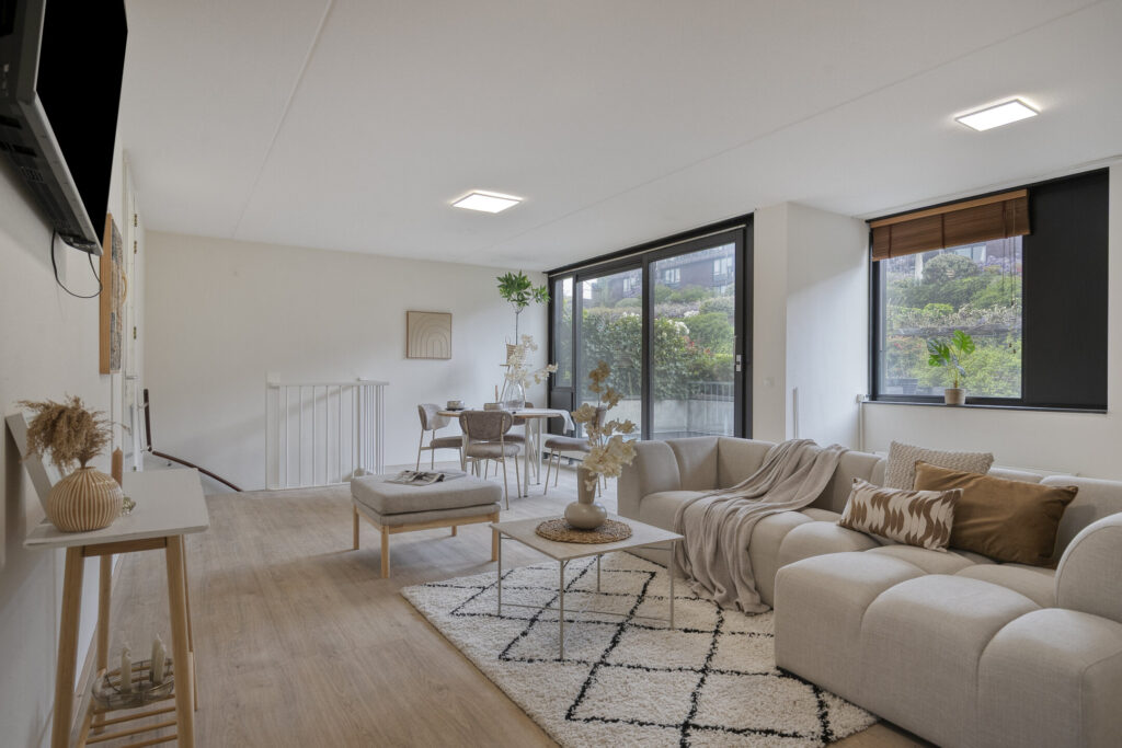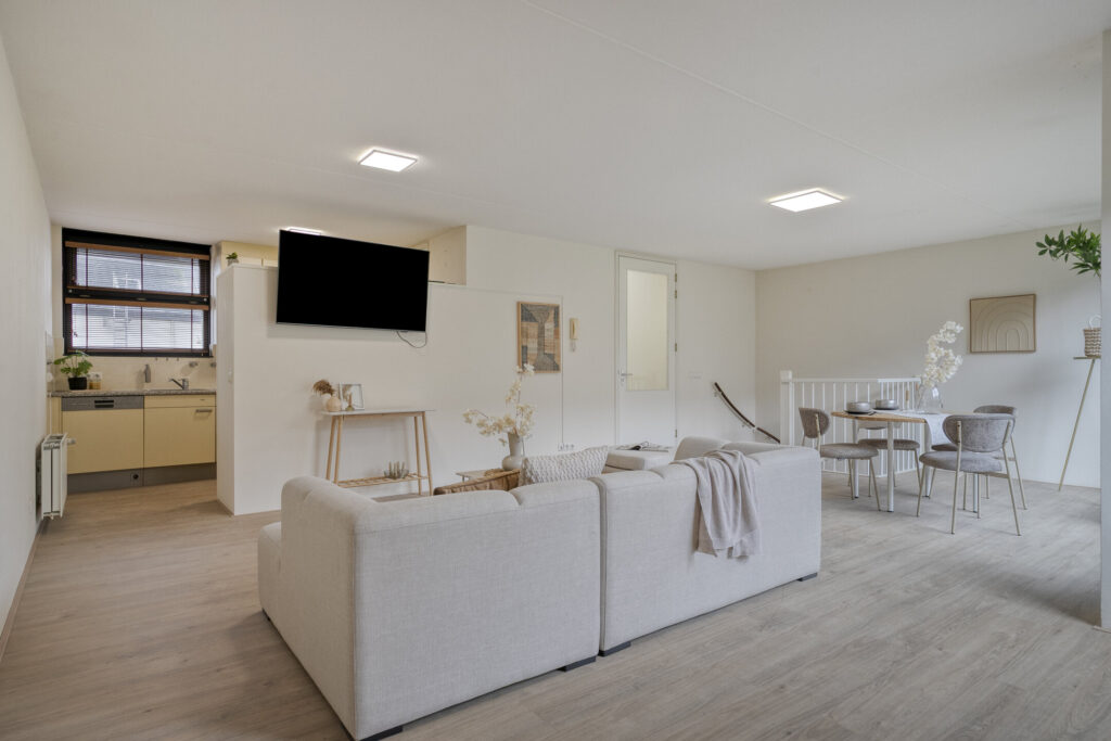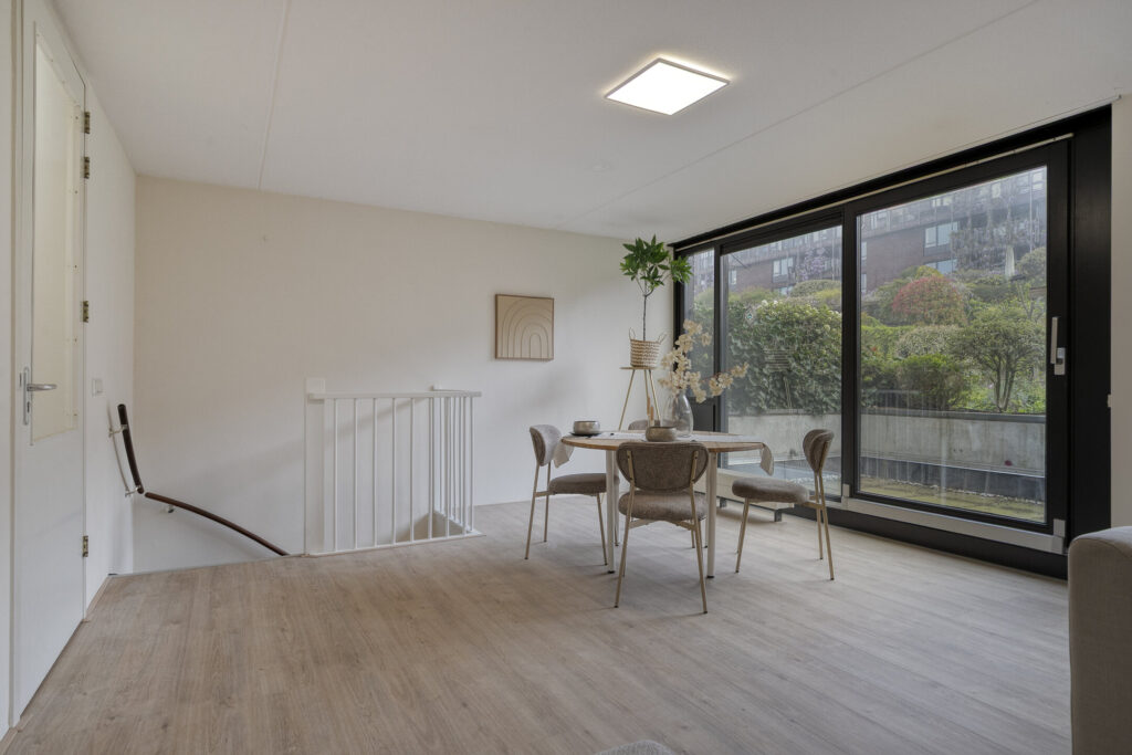 De vaste trapopgang op de eerste verdieping kom je uit in de open woonkamer op de tweede verdieping. De royale woonkamer beschikt over een ruim eetgedeelte aan de voorzijde en een sfeervol zitgedeelte aan de achterzijde. Een grote schuifpui leidt naar het een fijn dakterras. Via een portaal aan de voorzijde bereik je de toiletruimte, voorzien van wandcloset en fonteintje.