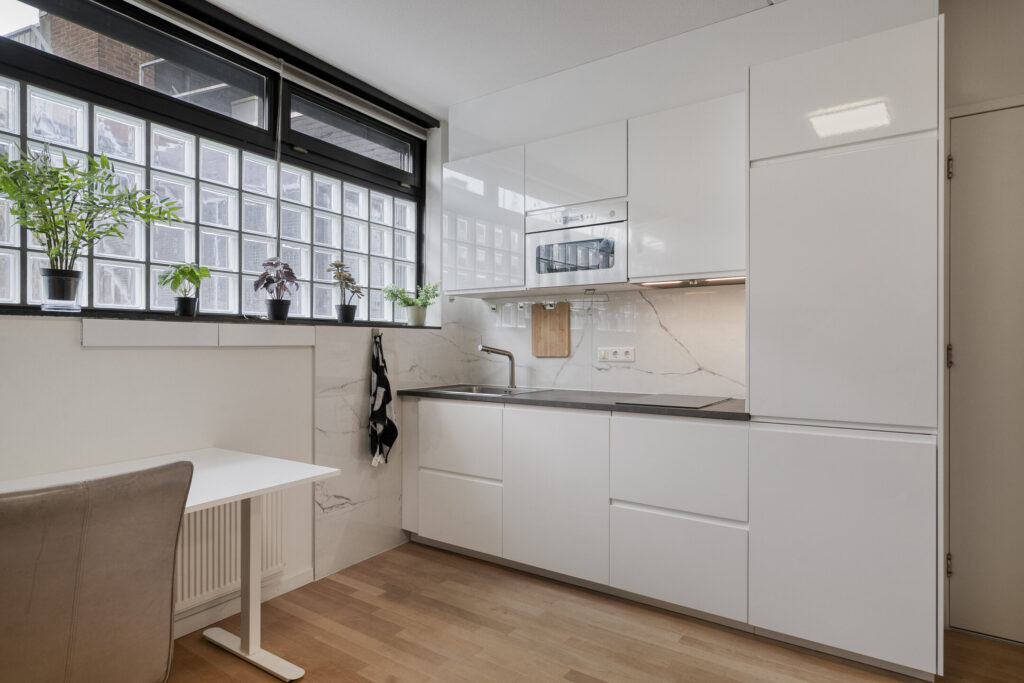 Het atelier op de begane grond is multifunctioneel te gebruiken. De ruimte is voorzien van een nette laminaatvloer en houten kozijnen met HR++ beglazing. Tevens is er een open keuken aanwezig. Deze is modern en praktisch ingericht in een rechte opstelling met onder- en bovenkasten in een witte kleurstelling en een zwart werkblad. De keuken is voorzien van een magnetron, koelkast, vrieskast, 2-zone inductiekookplaat met afzuigkap en een grote spoelbak.