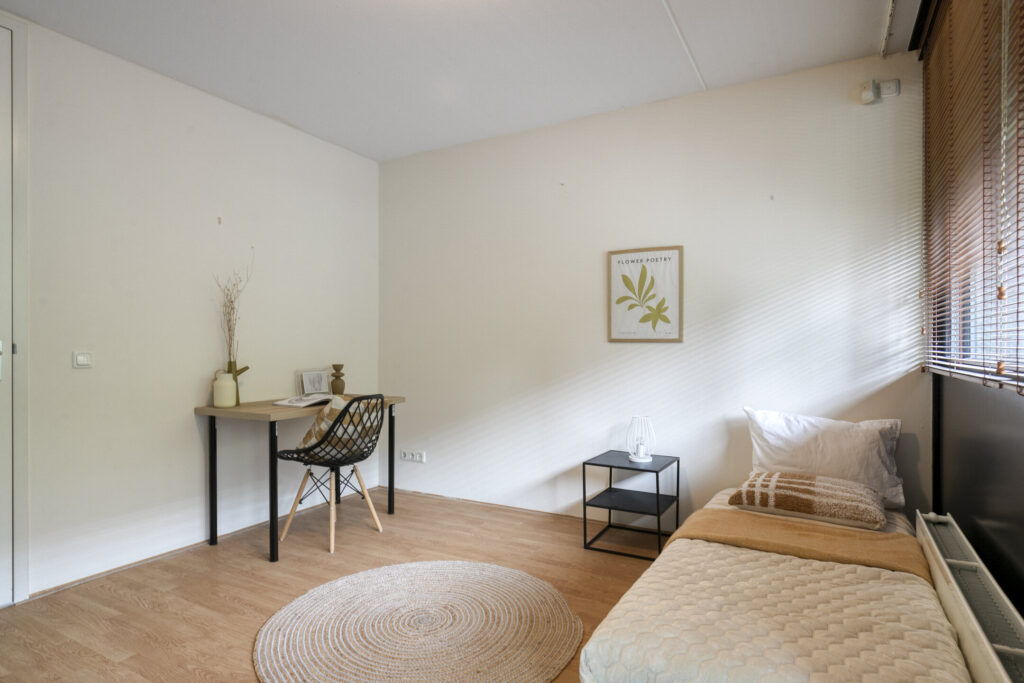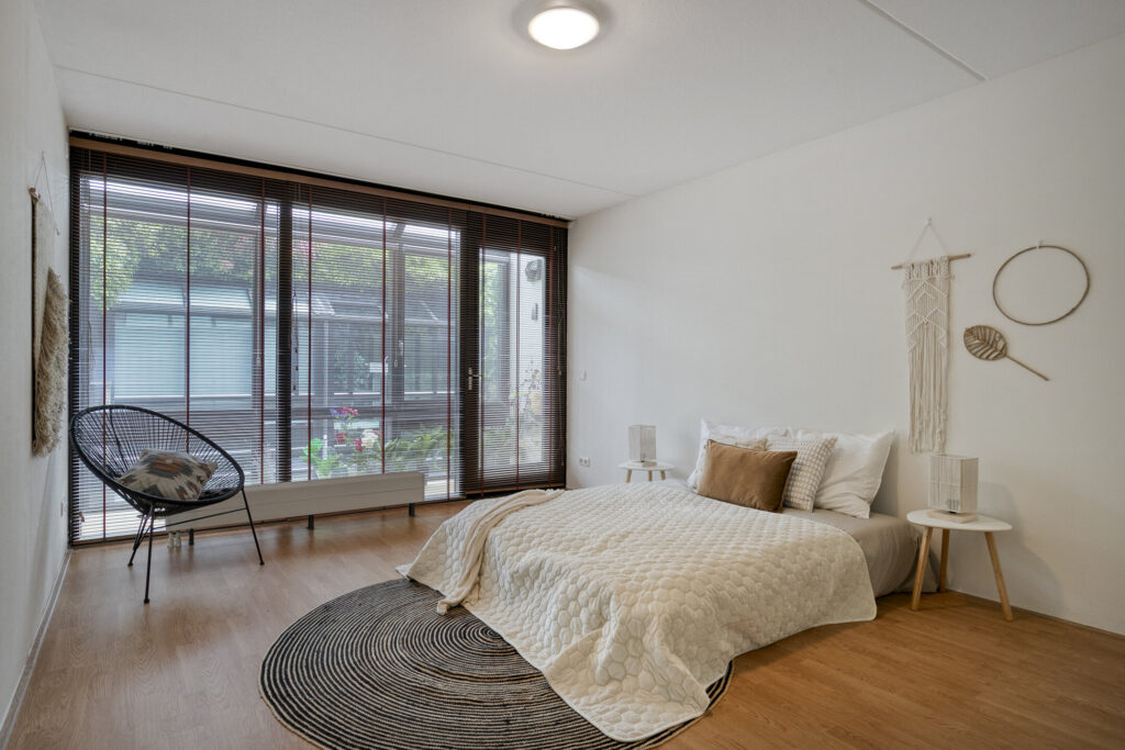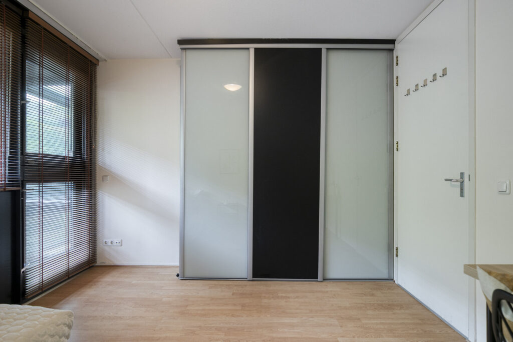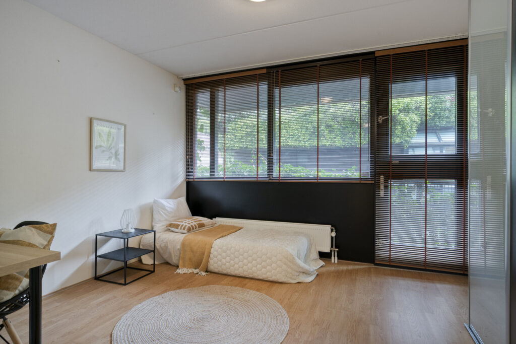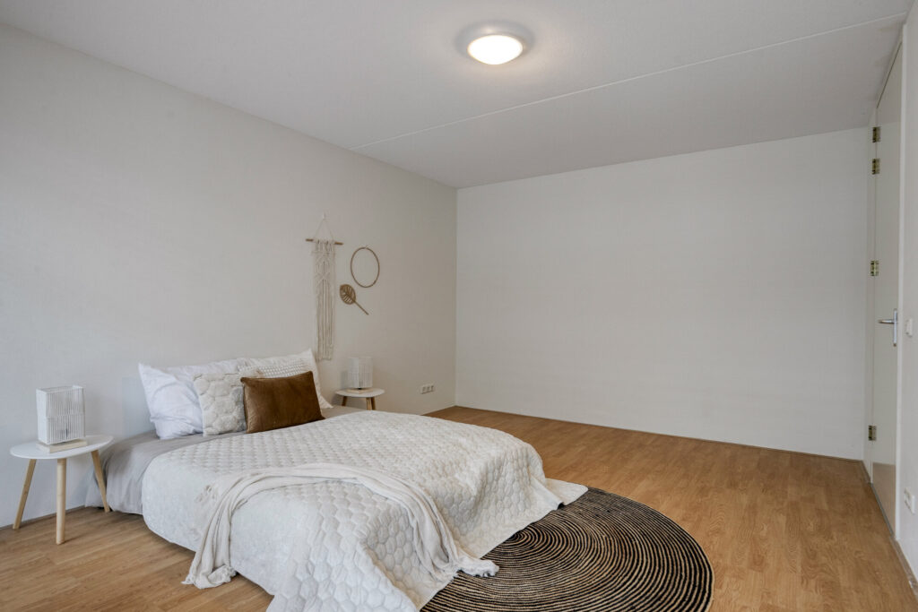 Slaapkamer 2 (circa 12 m²) is eveneens ruim en is voorzien van een nette laminaatvloer en houten kozijnen met HR++ beglazing. Daarnaast beschikt de kamer over een vaste kast met schuifwanden en een duodeur biedt toegang tot het balkon aan de voorzijde. Dit balkon biedt een mooi uitzicht op de groenvoorzieningen in de straat.