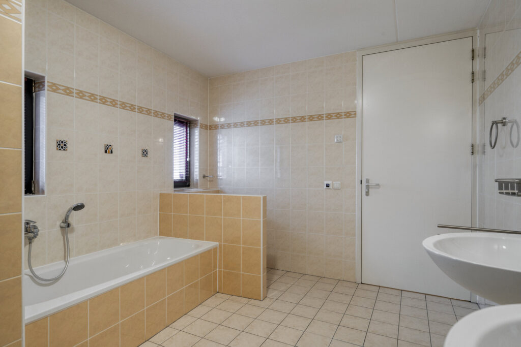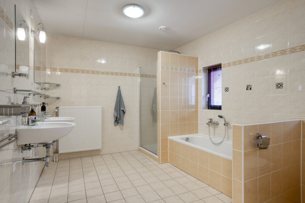 Aan de achterzijde van deze verdieping bevindt zich de badkamer. Deze is volledig betegeld en is uitgerust met twee wastafels, een douchehoek, een ligbad en een wandcloset. De ruimte wordt zowel mechanisch als natuurlijk geventileerd en beschikt over elektrische vloerverwarming.