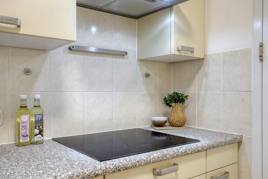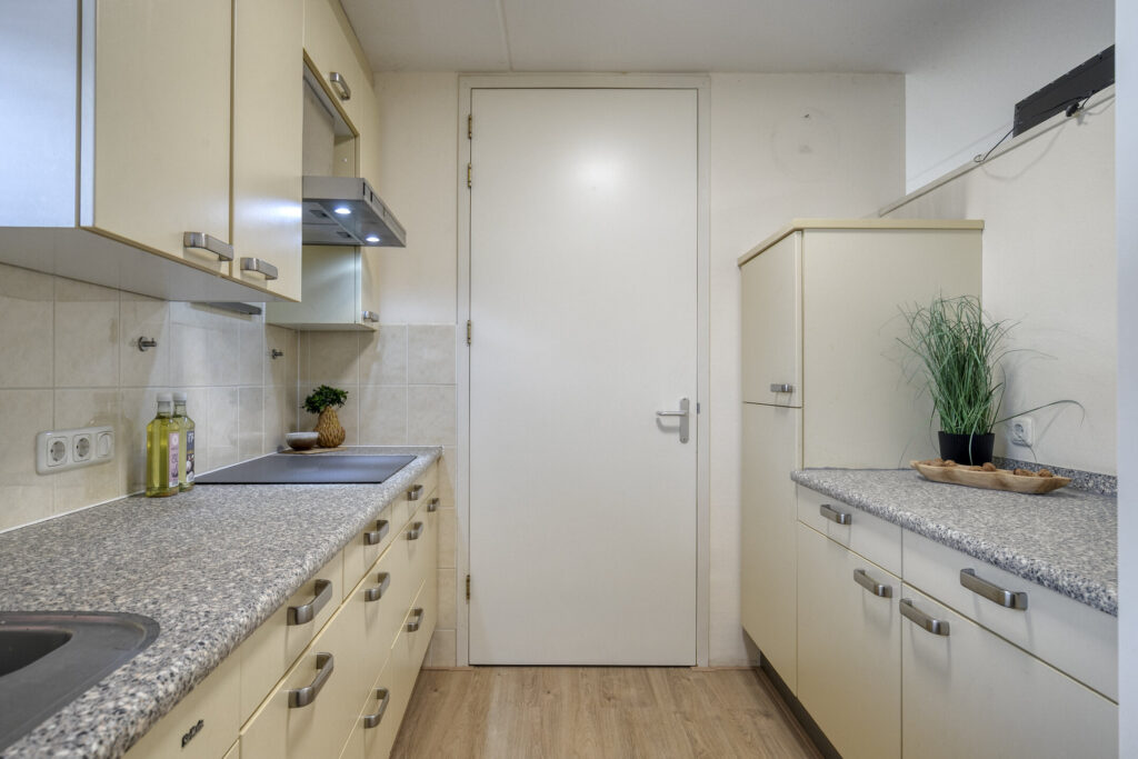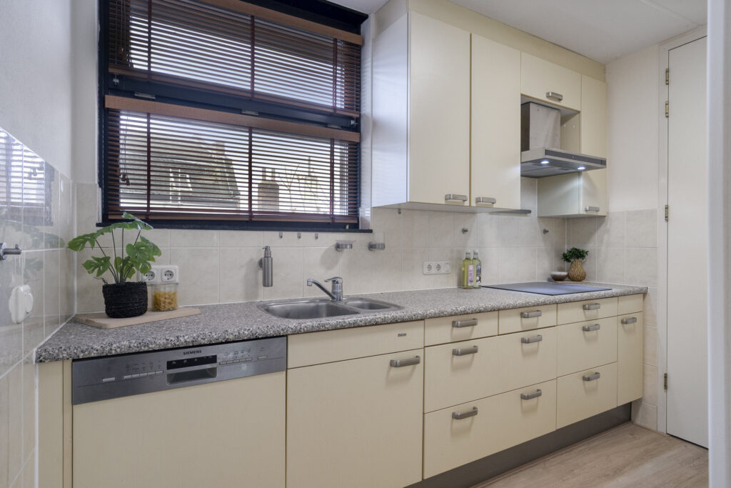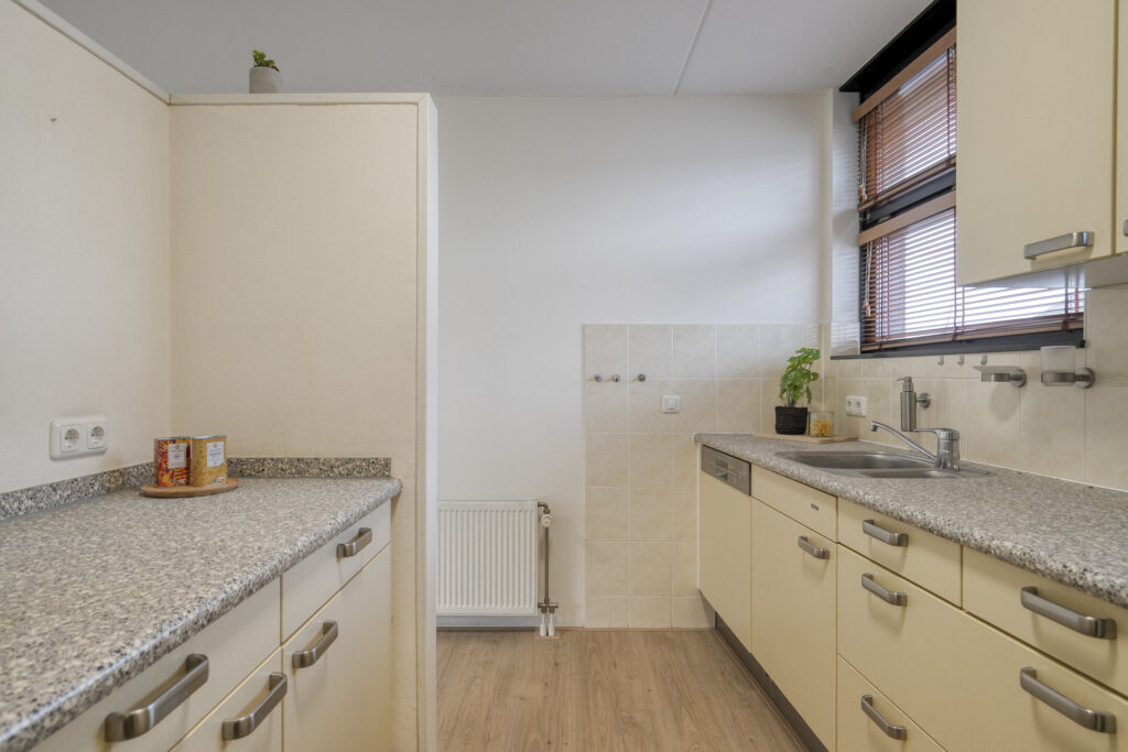 Het zitgedeelte van de woonkamer staat in semi-open verbinding met de keuken. Deze is modern ingericht met twee rechte opstellingen in een lichte kleurstelling en een composiet werkblad. De keuken is uitgerust met een koelkast, 1½ spoelbak, vaatwasser, inductiekookplaat en een afzuigkap. Het raam is voorzien van een screen. Achter in de keuken bevindt zich een vaste provisie ruimte waar voldoende ruimte is voor extra voorraad en een extra koel-/vriescombinatie.