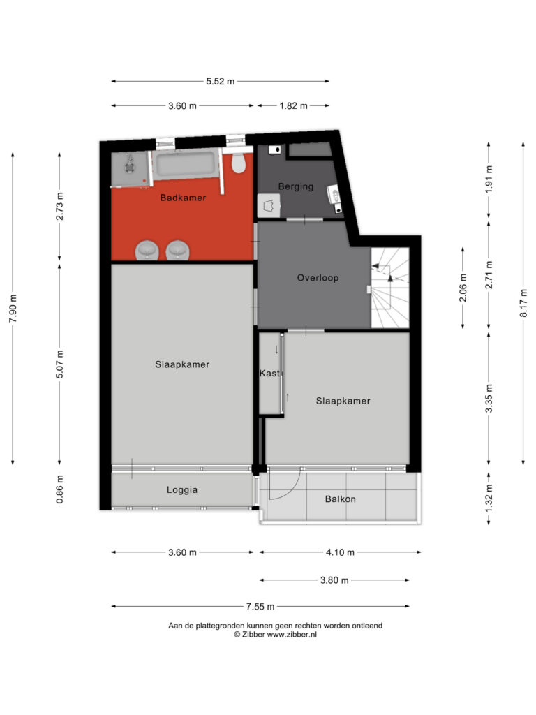 De trapopgang leidt naar de overloop op de eerste verdieping, die toegang biedt tot twee slaapkamers, de badkamer en de technische ruimte.