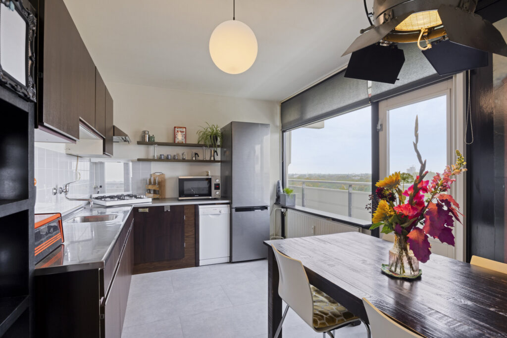 De grote en gesloten woonkeuken (circa 13 m²) is voorzien ven eenvoudige keukeninrichting in een hoekopstelling met een RVS aanrechtblad, spoelbak, gaskookplaat, afzuigkap, vaatwasser (2020) en een koel-/vriescombinatie (2022). De diverse boven- en onderkasten bieden voldoende bergruimte en ook vanuit hier is het balkon te bereiken. Het betreft een grote woonkeuken, ruim genoeg voor het plaatsen van een ruime eettafel. Op de vloer ligt een nette (industriële) betonlook PVC-vloer, gelegd in 2022. Tijdens het koken kun je mooi ver weg kijken over Eindhoven, hoe uniek is dat voor deze prijsklasse!