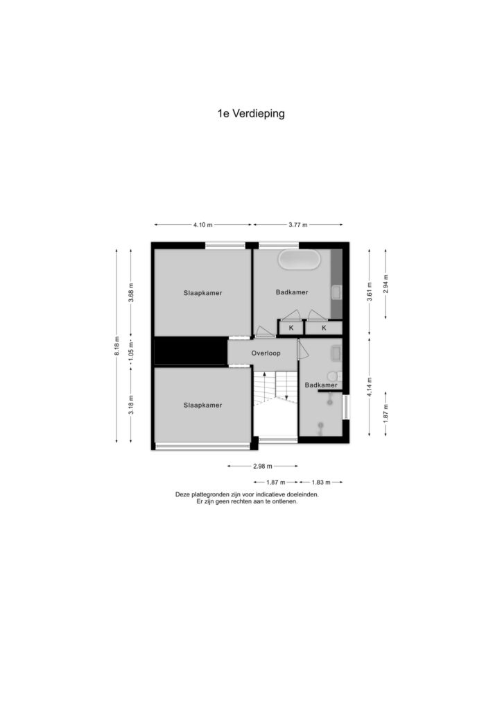 De verdieping beschikt over twee badkamers. De eerste badkamer is uitgerust met een ligbad, wastafel en vaste kasten. De tweede badkamer heeft een royale inloopdouche, toilet en wastafelmeubel, wat extra comfort biedt.
