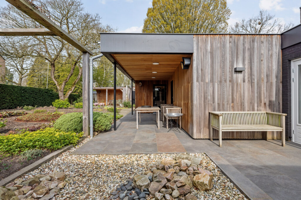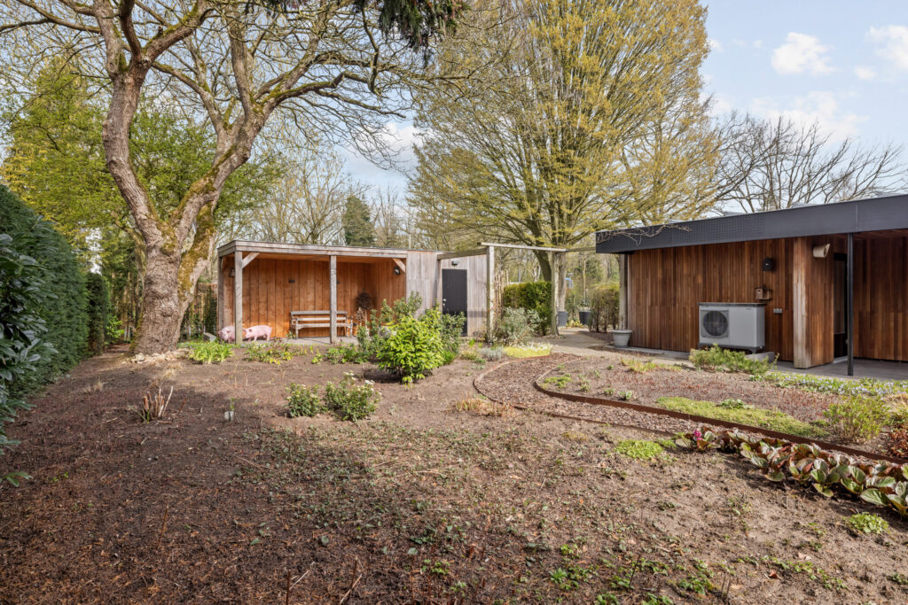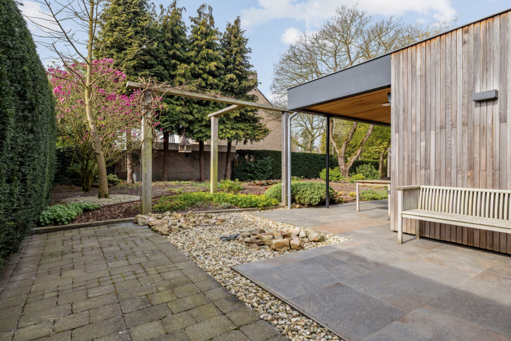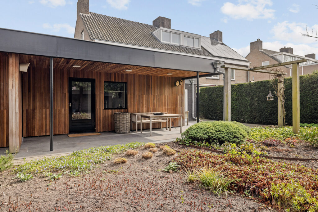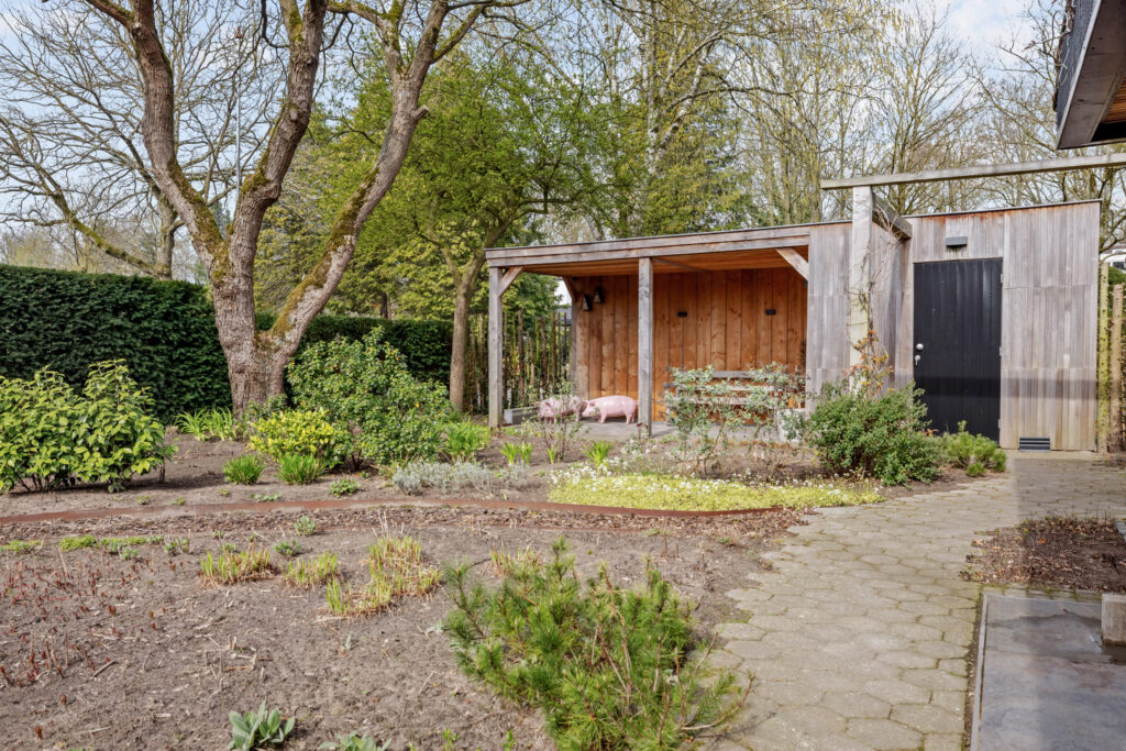 De nette aangelegde achtertuin beschikt over meerdere terrassen, groene borders en een bijgebouw met overkapping en bergruimte. De zijtuin met terras biedt volop ruimte en privacy, perfect om buiten te zitten en te ontspannen.