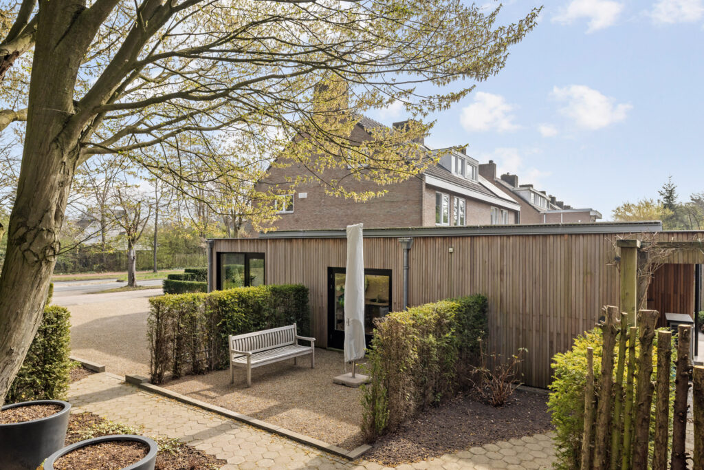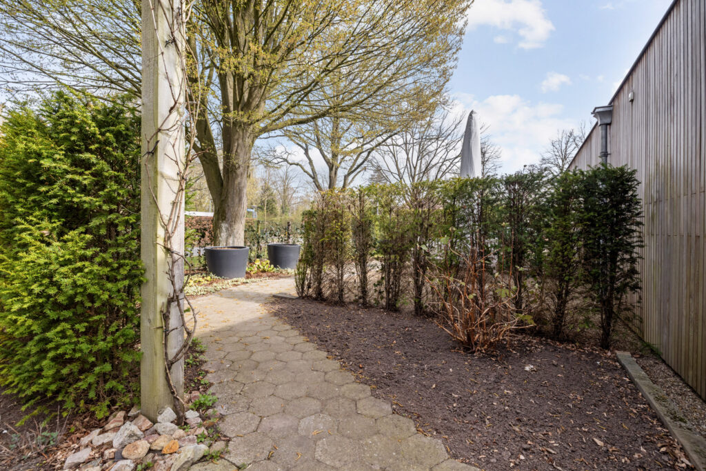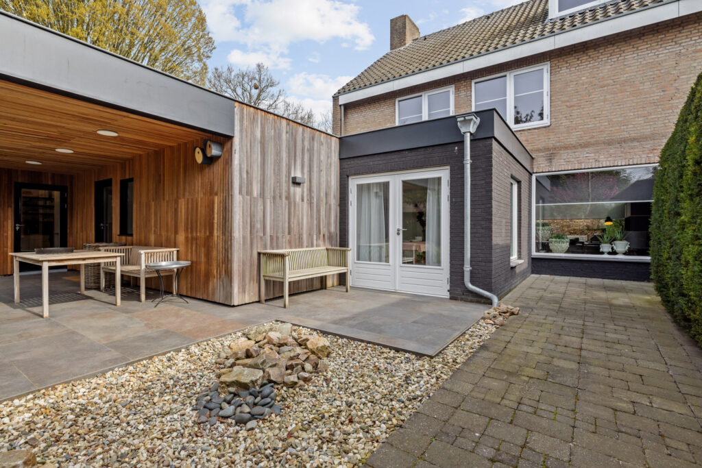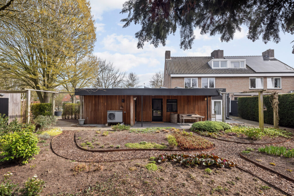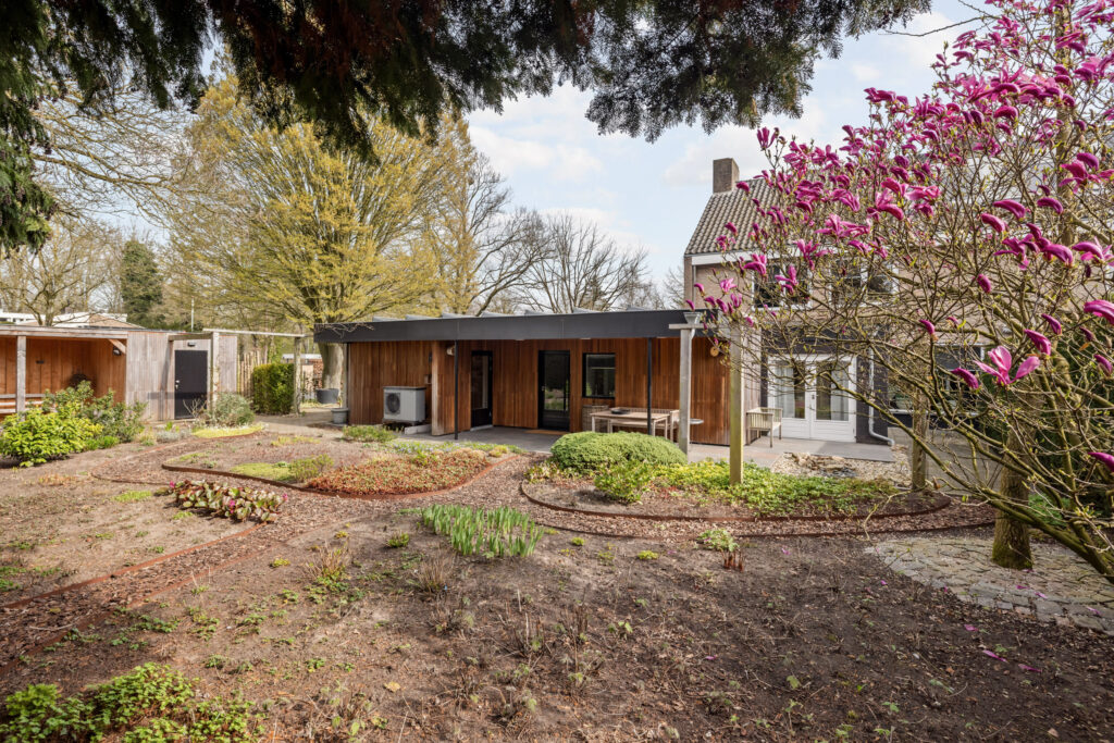 De nette aangelegde achtertuin beschikt over meerdere terrassen, groene borders en een bijgebouw met overkapping en bergruimte. De zijtuin met terras biedt volop ruimte en privacy, perfect om buiten te zitten en te ontspannen.