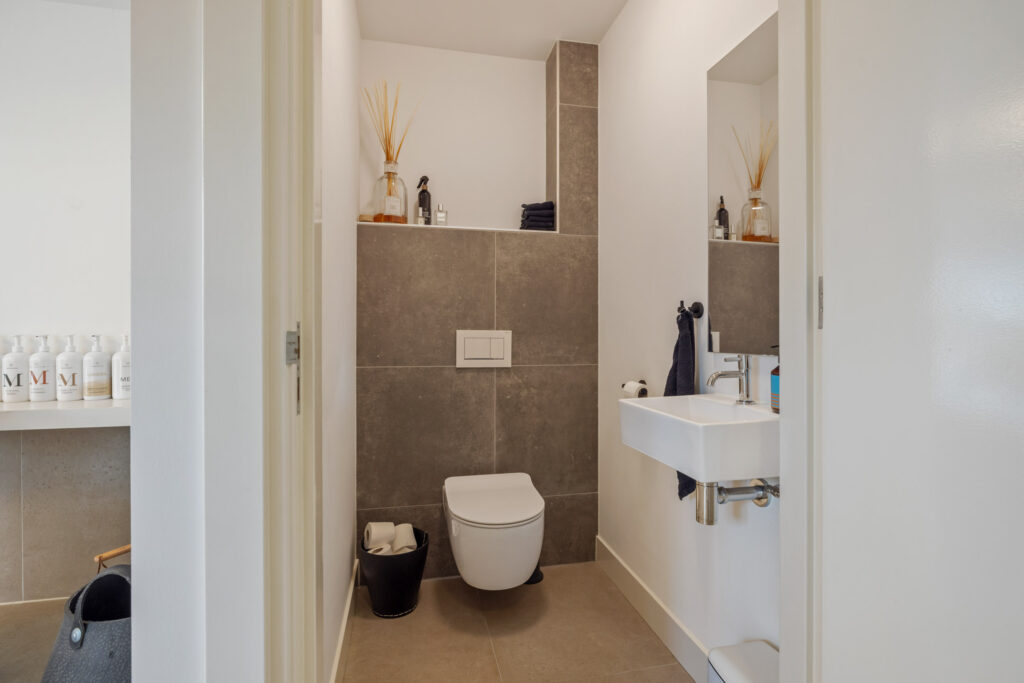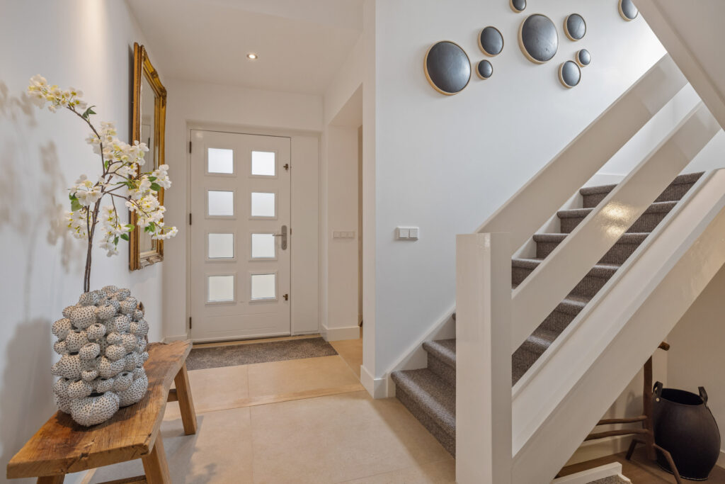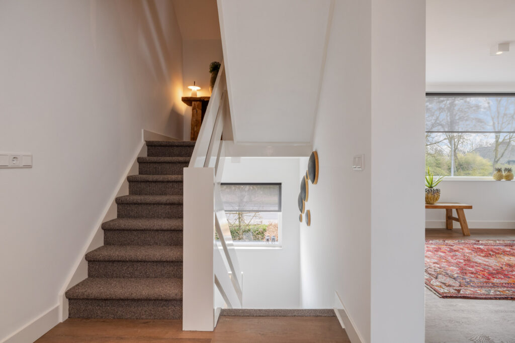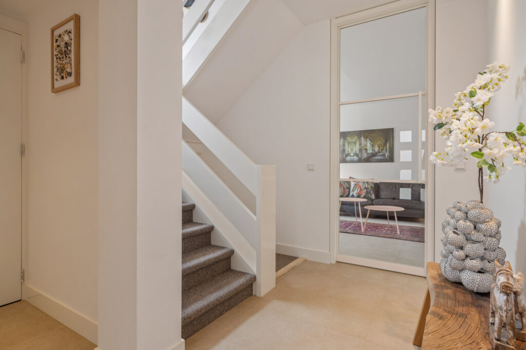 U komt binnen in de ruime en strak afgewerkte hal van de woning. Hier bevinden zich de meterkast, een praktische bergruimte onder de trap en een toiletruimte met fonteintje.