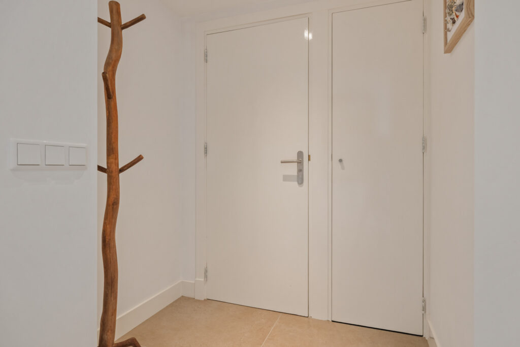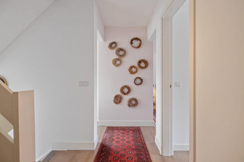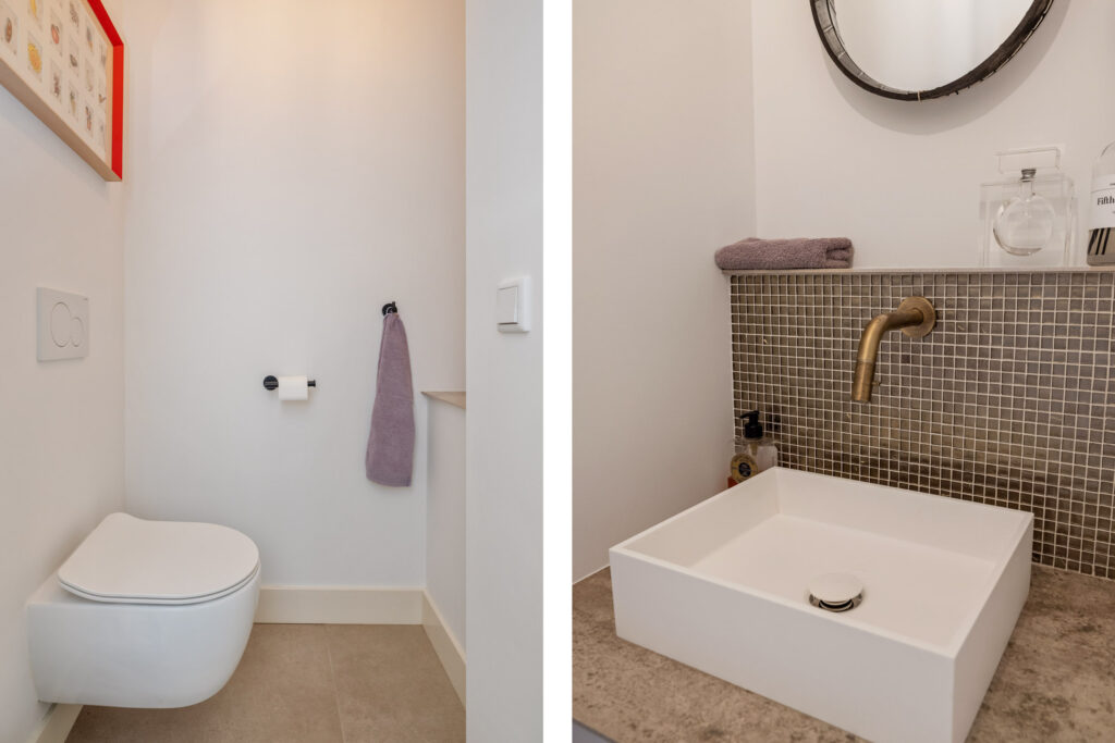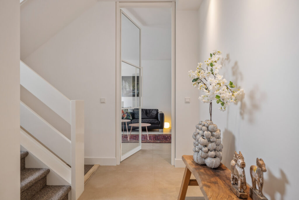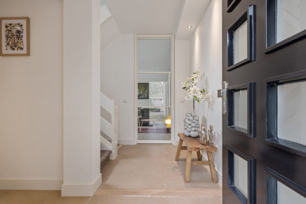 U komt binnen in de ruime en strak afgewerkte hal van de woning. Hier bevinden zich de meterkast, een praktische bergruimte onder de trap en een toiletruimte met fonteintje.
