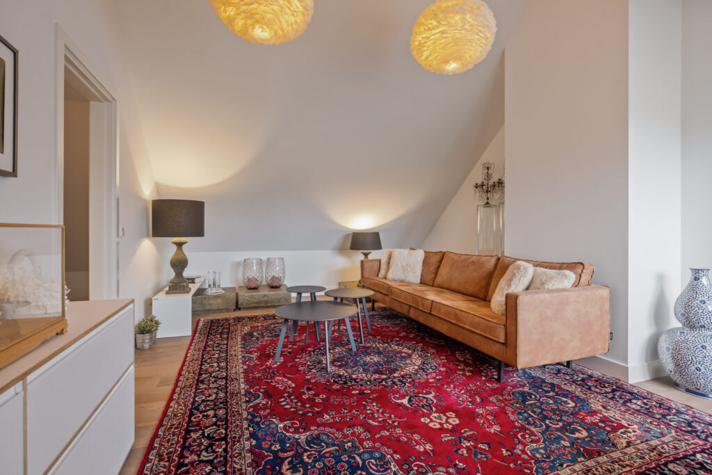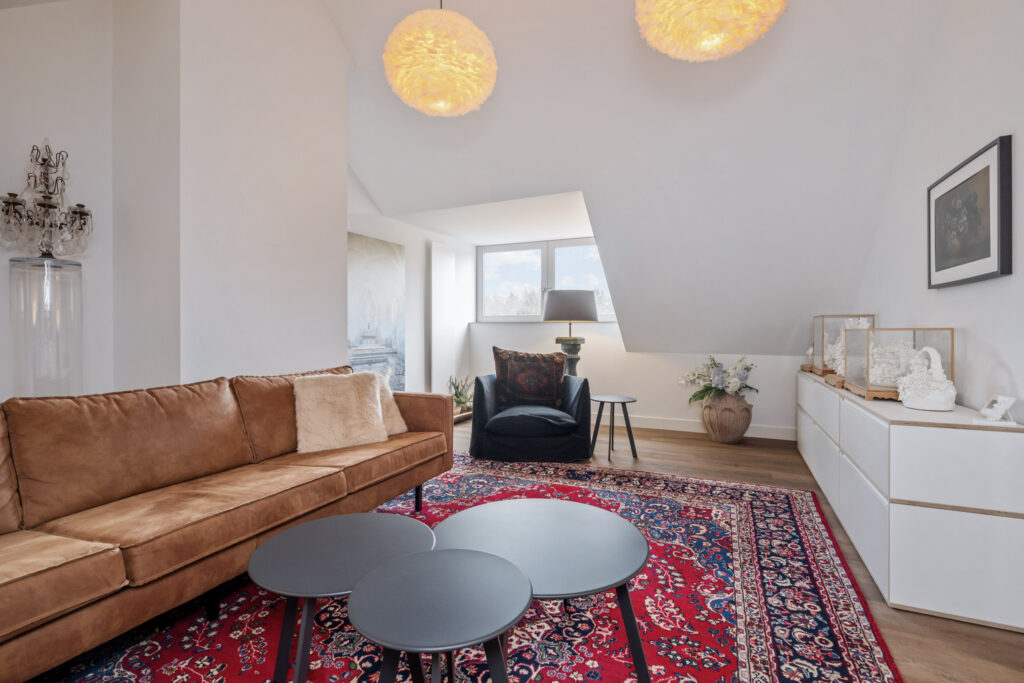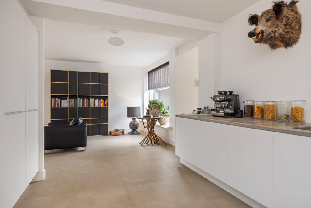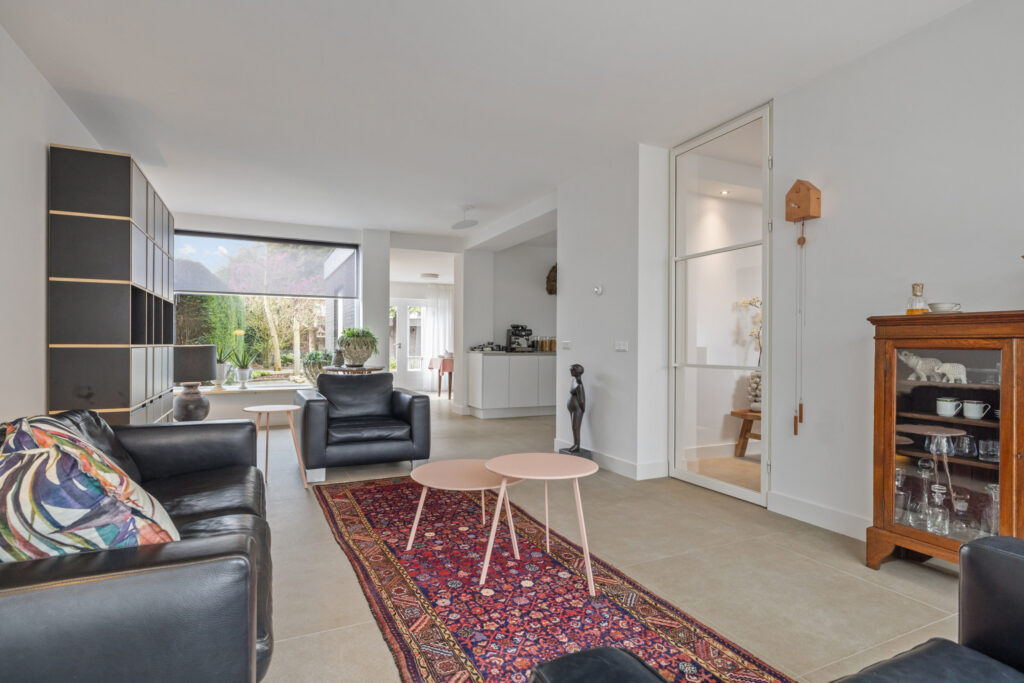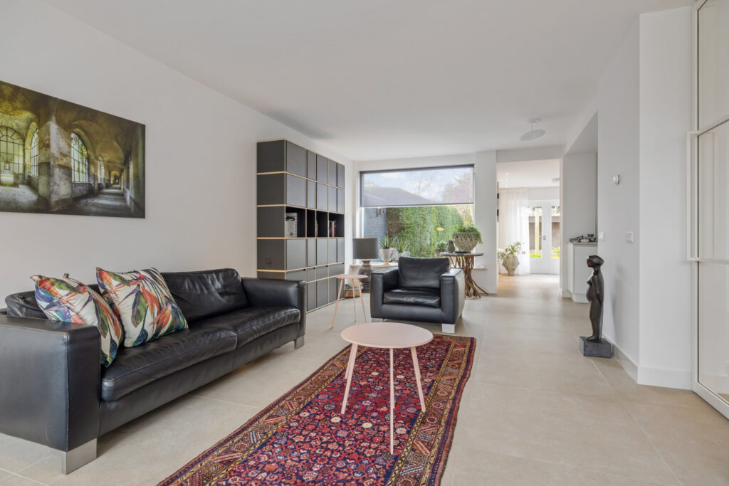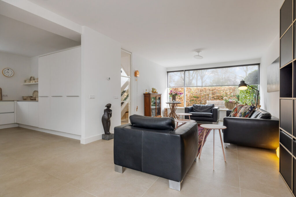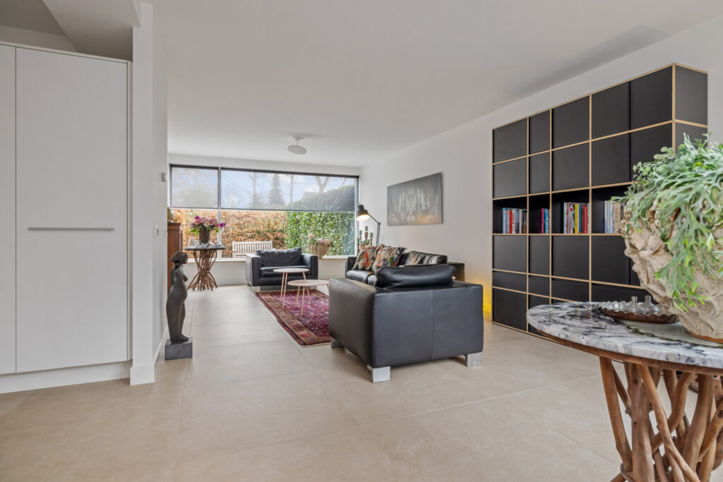 De woonkamer bereikt u via een stijlvolle stalen deur. Hier vallen direct de ruimte en hoogwaardige afwerking op. De betegelde vloer in combinatie met vloerverwarming en vloerkoeling zorgt voor een aangenaam woonklimaat. Dankzij de grote raampartijen geniet de woonkamer van veel natuurlijk licht, wat zorgt voor een lichte leefruimte.