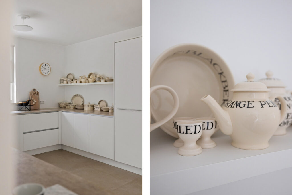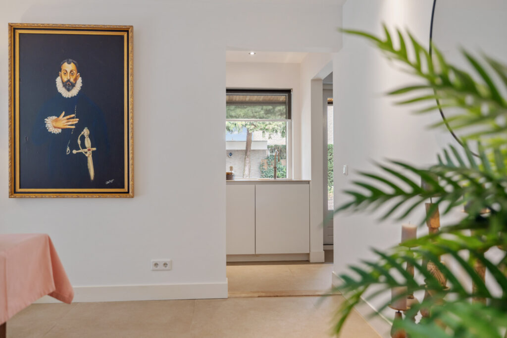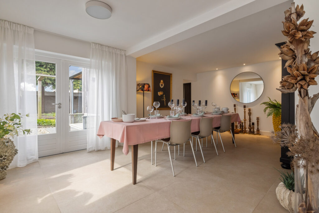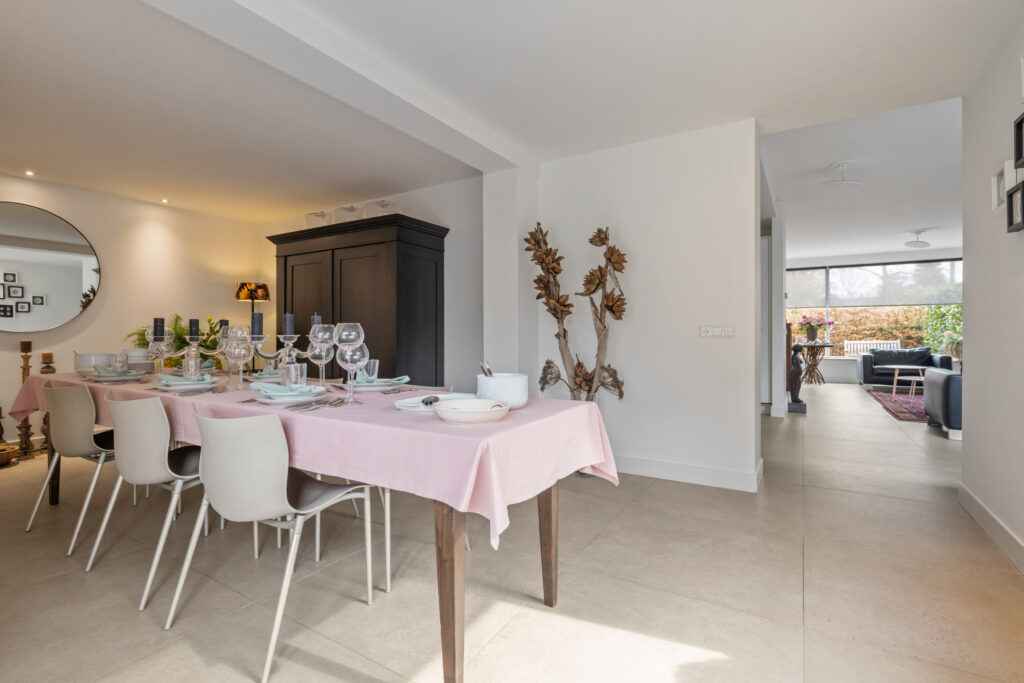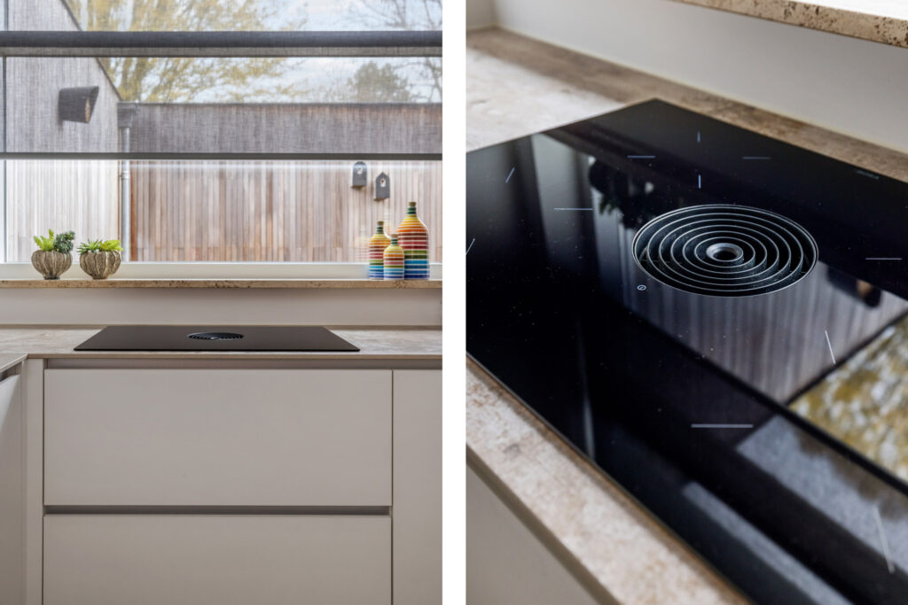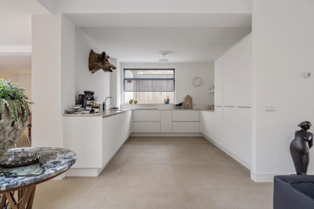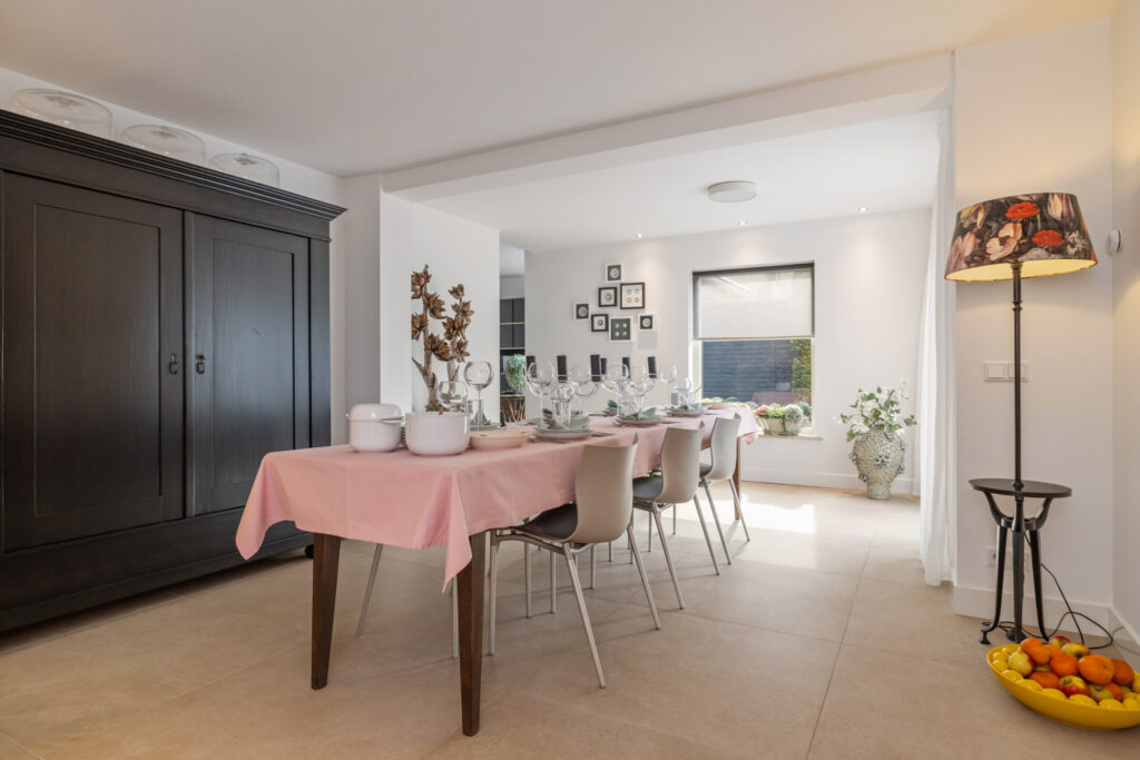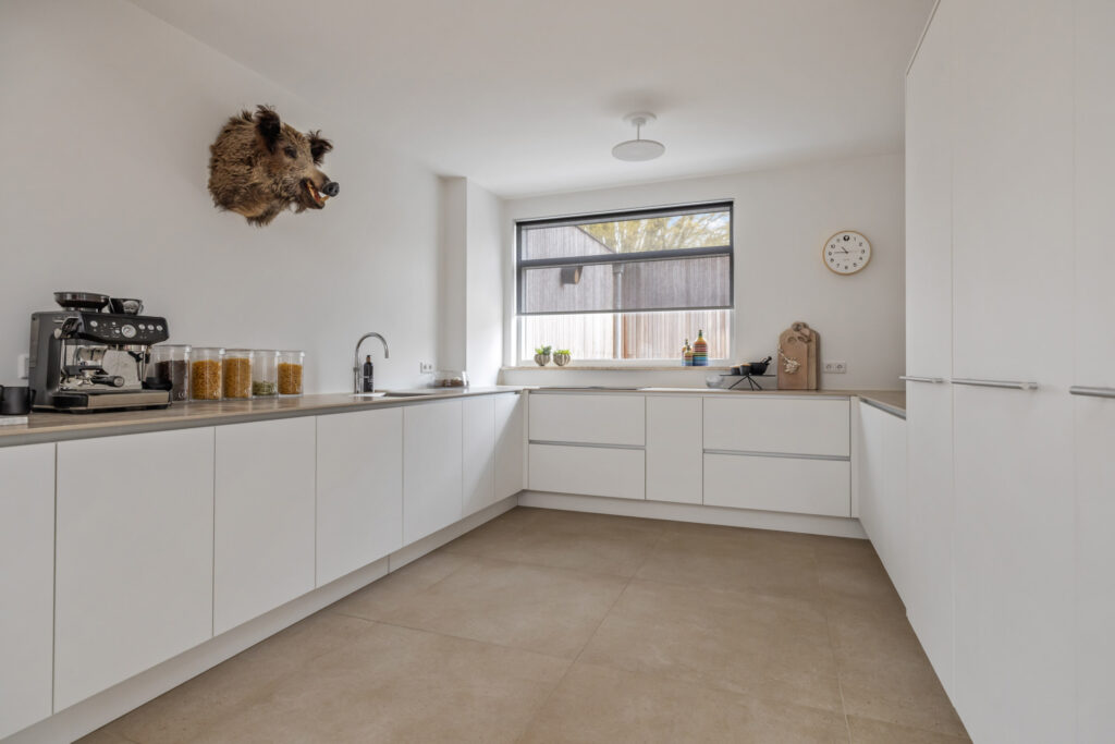 De woonkeuken van de woning is uitgevoerd in een U-opstelling en voorzien van een composiet werkblad en hoogwaardige inbouwapparatuur, waaronder een Bora inductiekookplaat met geïntegreerde afzuiging, Quooker, vaatwasser, oven, magnetron, koelkast en vriezer. Aansluitend bevindt zich de eetkamer met openslaande deuren naar de tuin, waardoor binnen en buiten naadloos in elkaar overlopen.