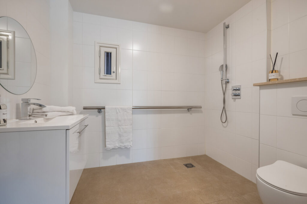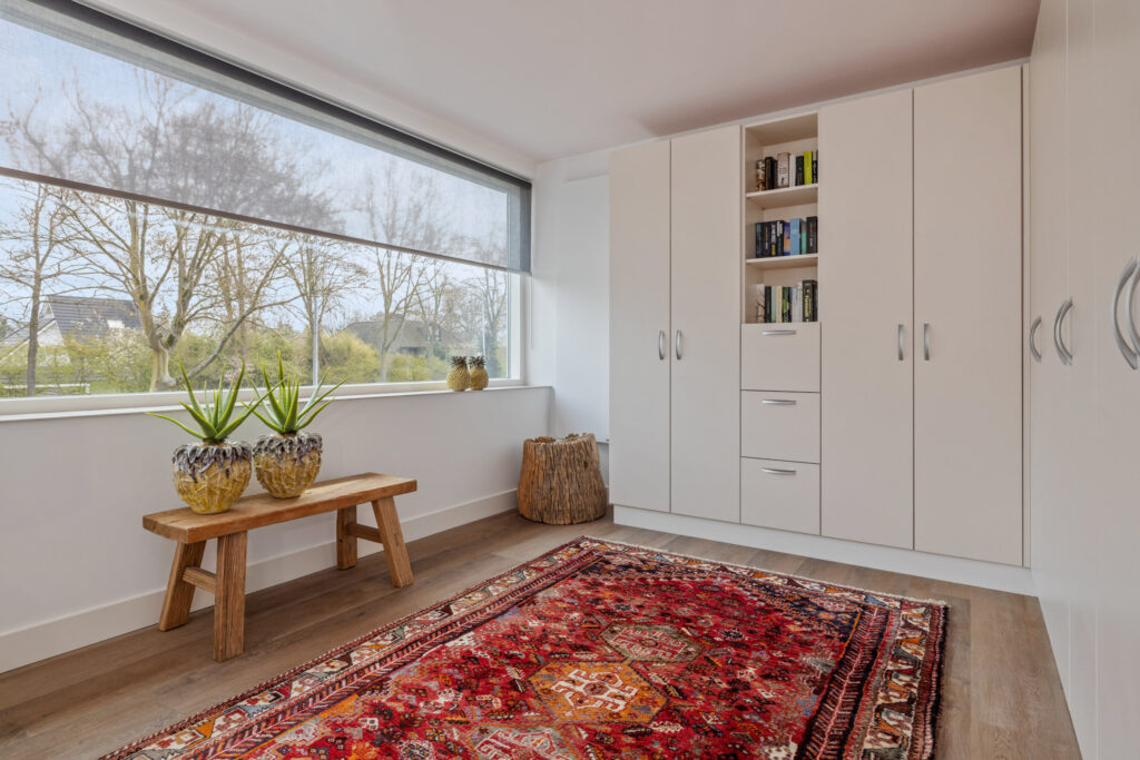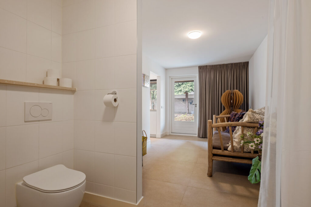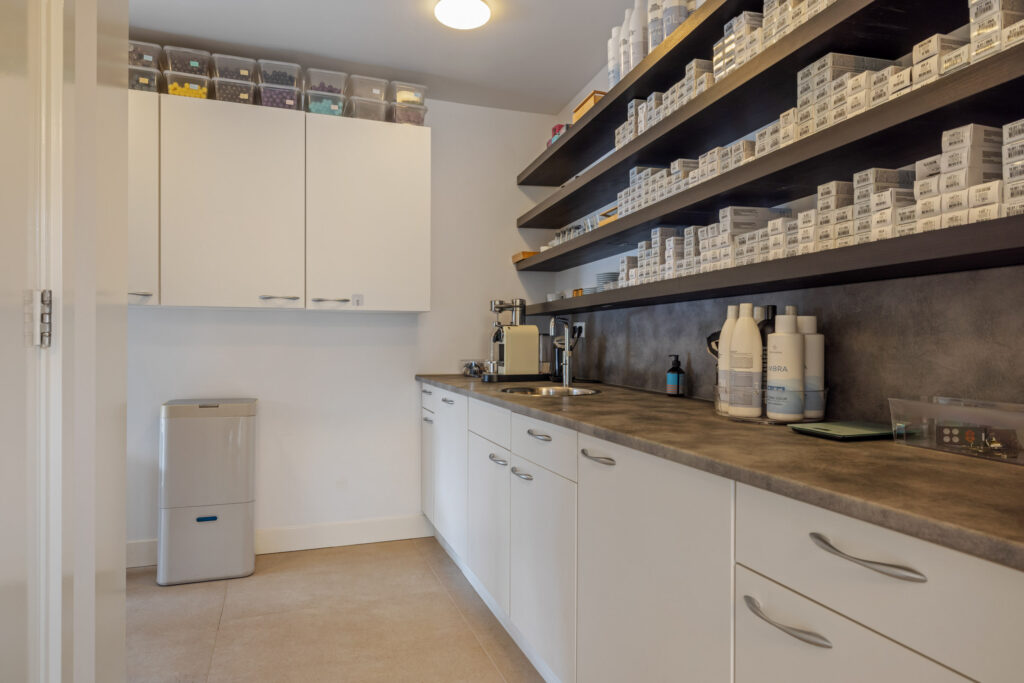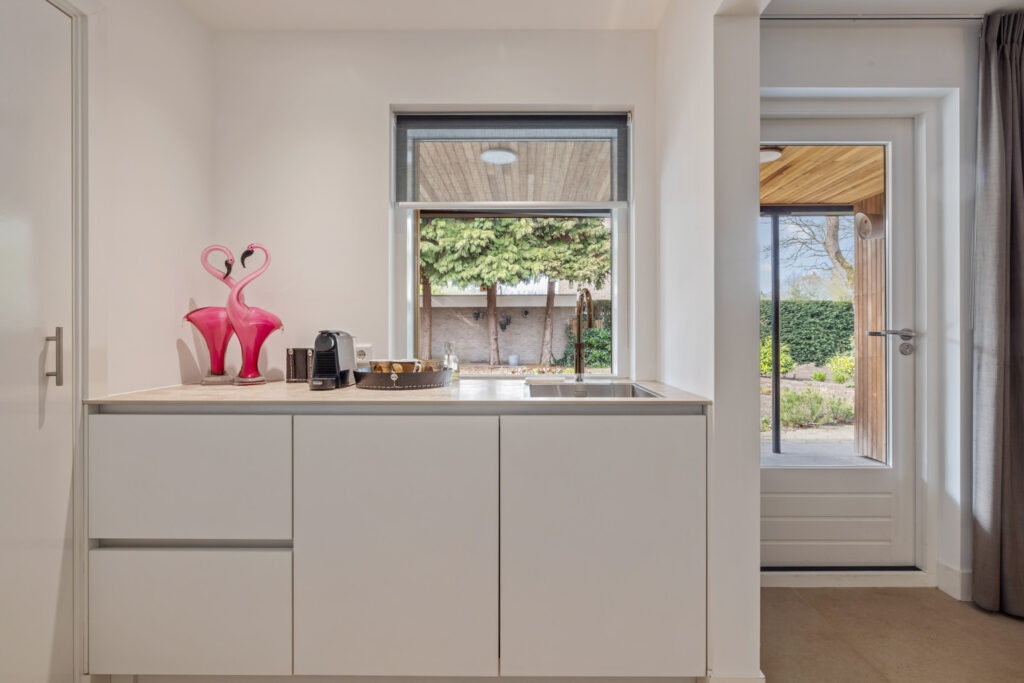 Vanuit de woonkamer loopt u naar de bijkeuken, die een eigen entree heeft en voorzien is van een pantry met spoelbak en koelkast. Samen met de aangrenzende slaap- of werkkamer en de eigen badkamer, uitgerust met douche, wastafel en toilet, vormt dit een zelfstandige woonunit op de begane grond. Ideaal voor inwonende familie of een au pair. Bovendien biedt deze ruimte directe toegang tot het overdekte terras.