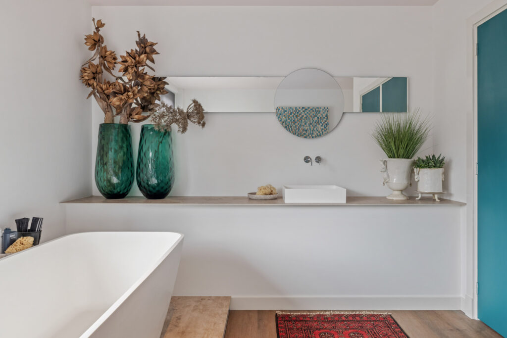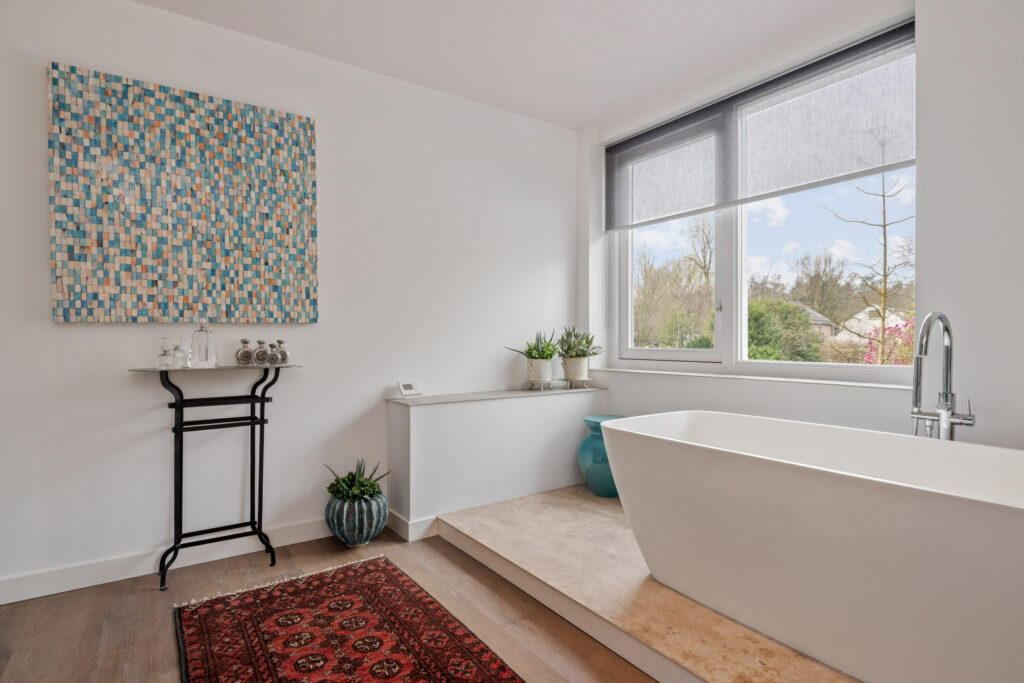 De verdieping beschikt over twee badkamers. De eerste badkamer is uitgerust met een ligbad, wastafel en vaste kasten. De tweede badkamer heeft een royale inloopdouche, toilet en wastafelmeubel, wat extra comfort biedt.