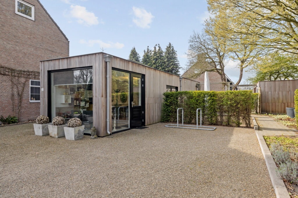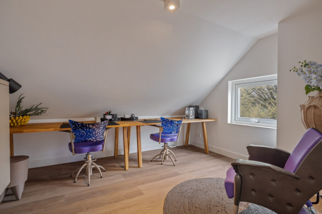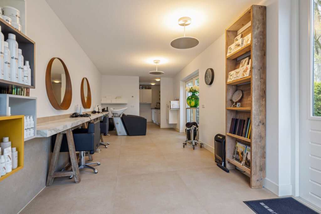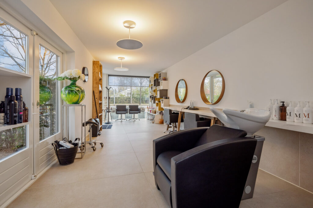 Via het overdekte terras bereikt u een volledig zelfstandige ruimte, momenteel ingericht als kapsalon. Deze ruimte beschikt over een eigen keukenblok, modern toilet en openslaande deuren naar zowel het terras als de oprit. Ideaal voor een praktijk of onderneming aan huis.