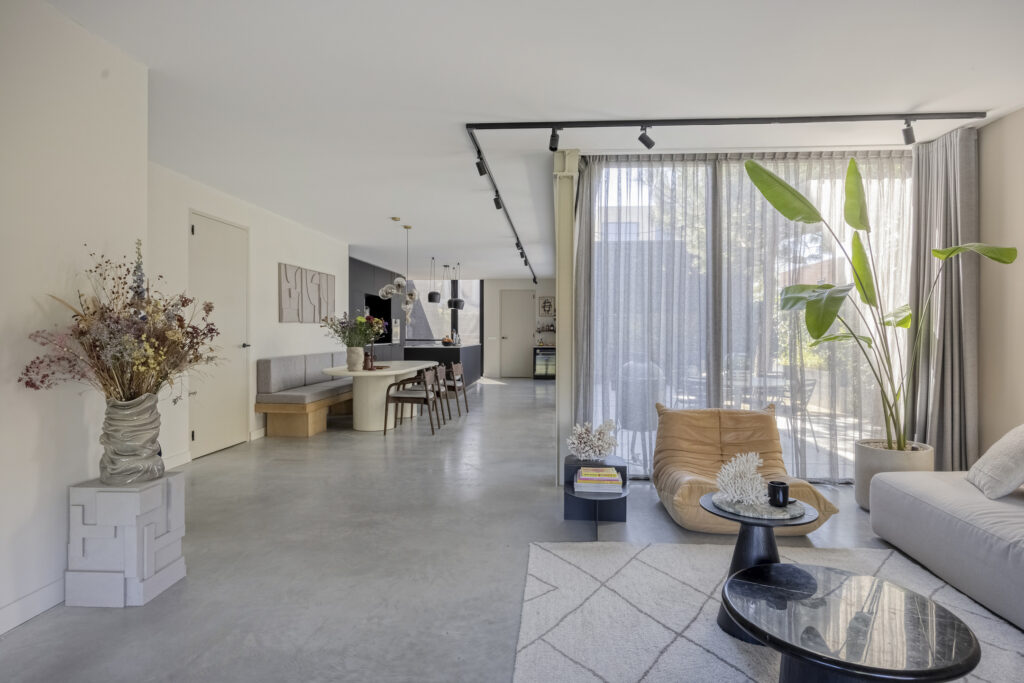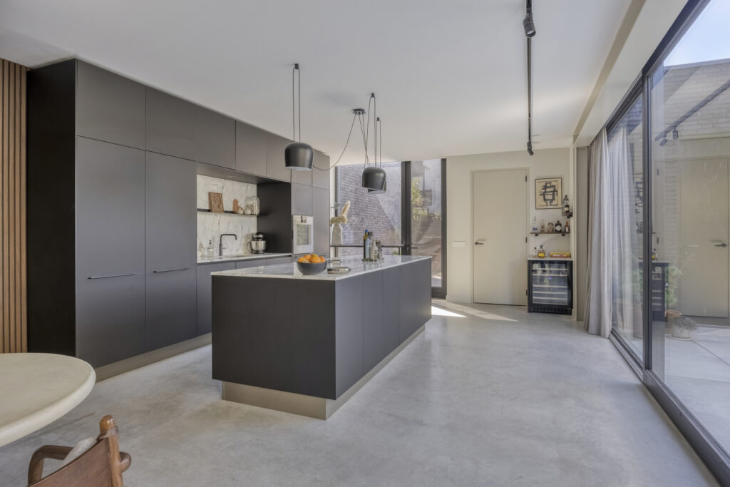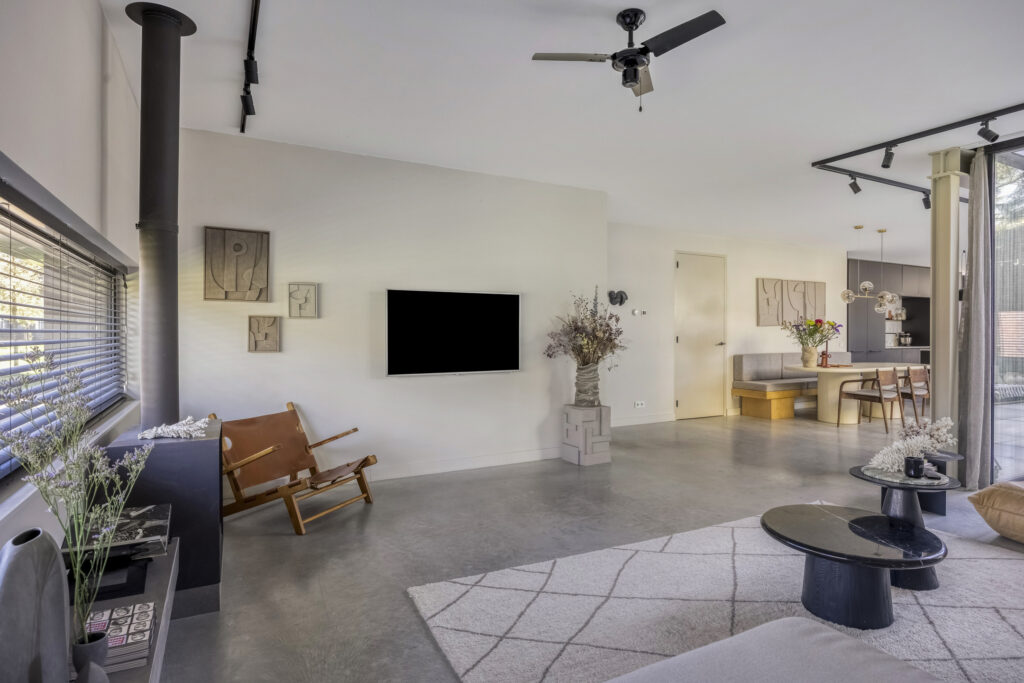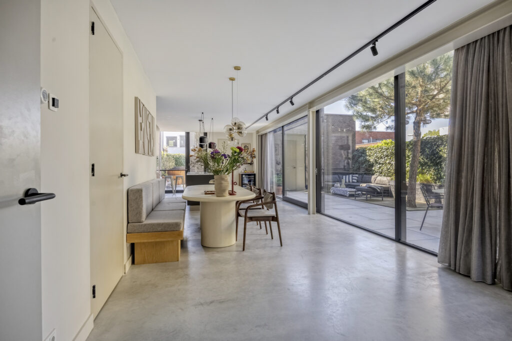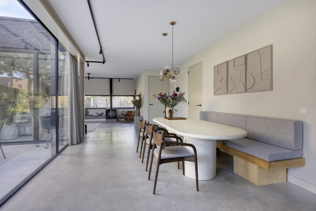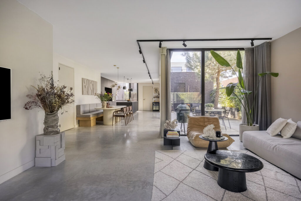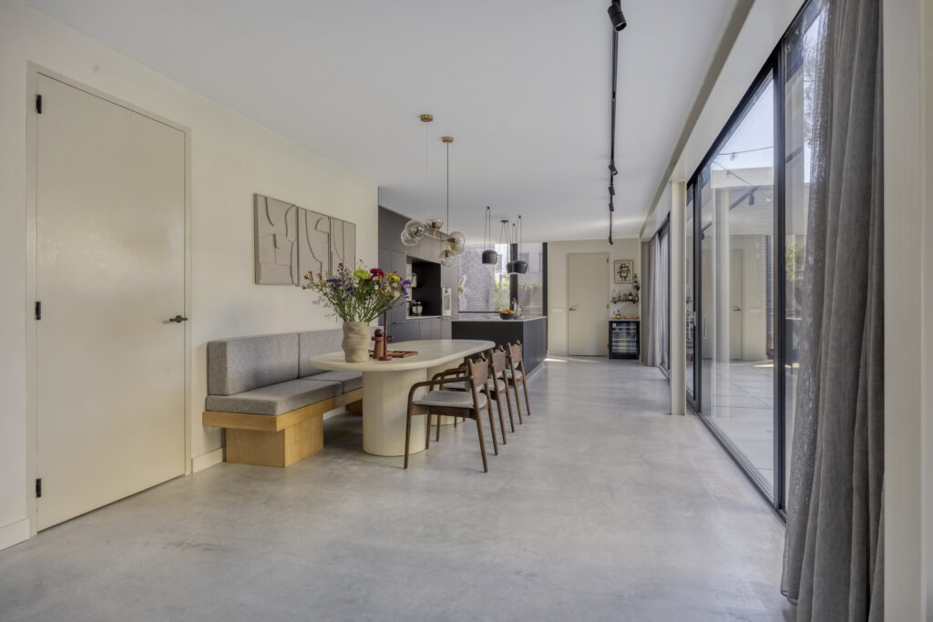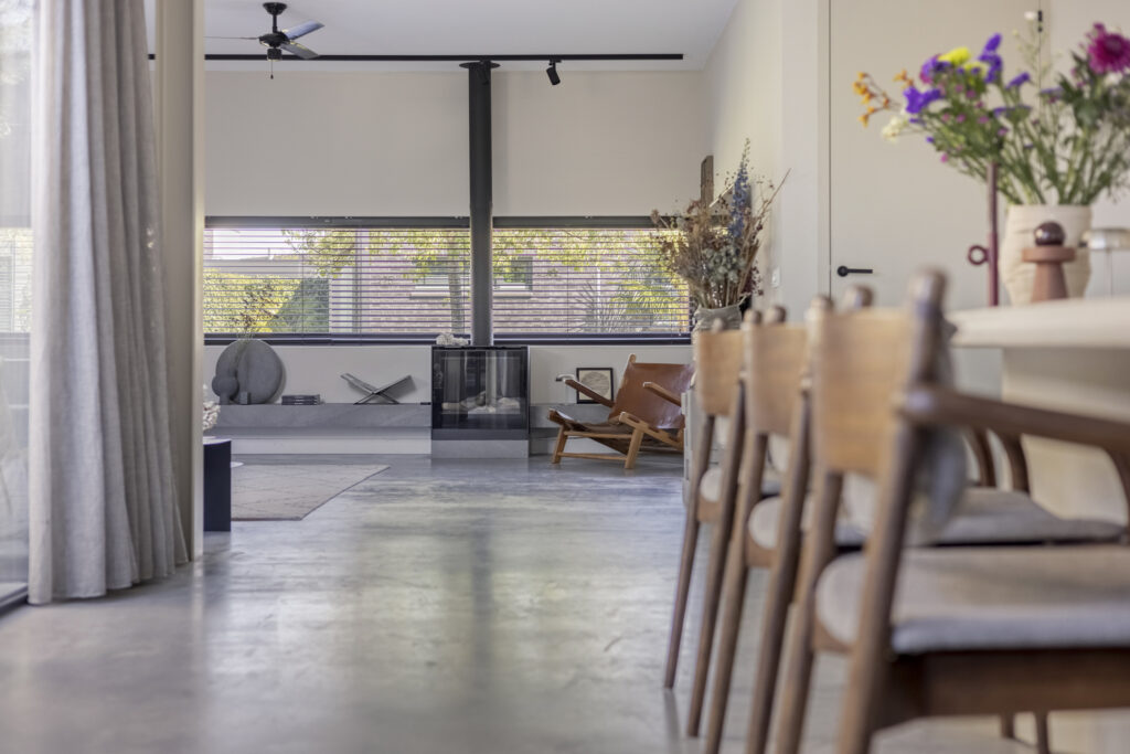 De gietvloer met vloerverwarming zorgt voor een moderne uitstraling en veel wooncomfort. Dankzij de grote raampartijen heb je een mooie verbinding met buiten en veel lichtinval.