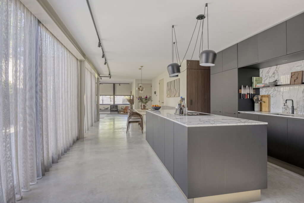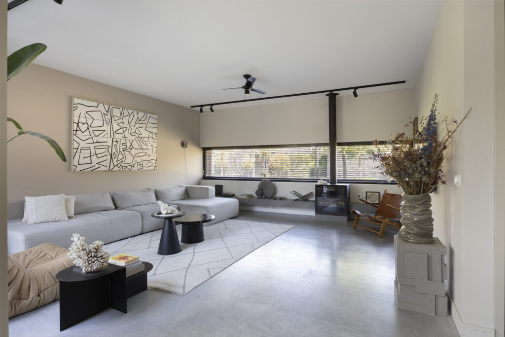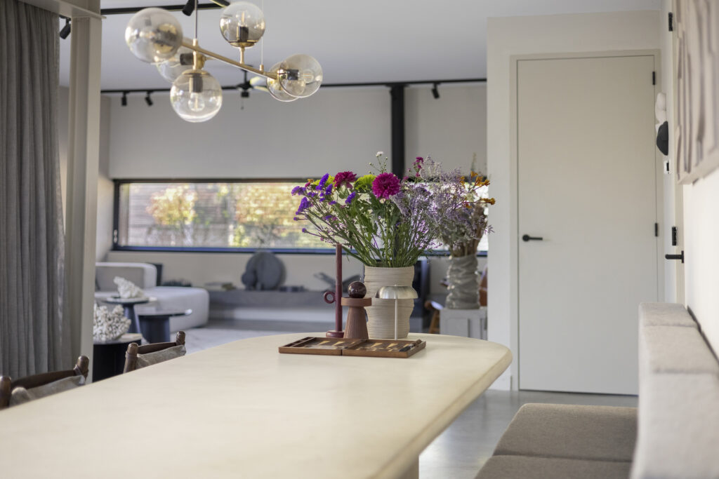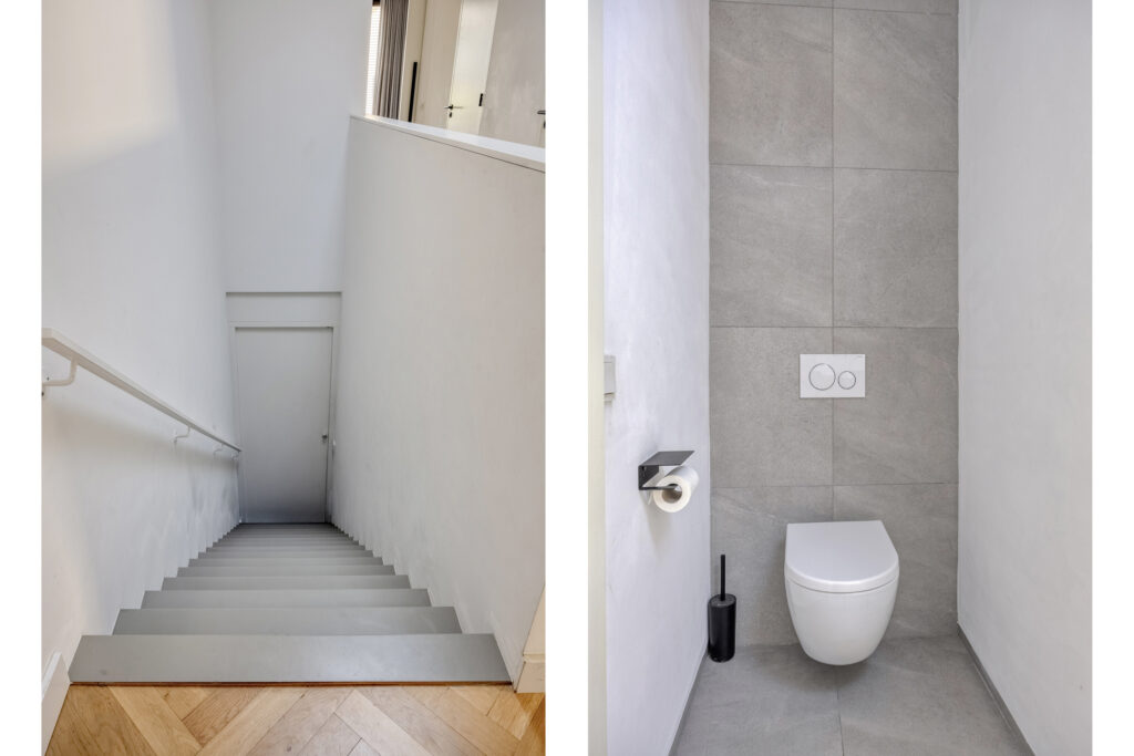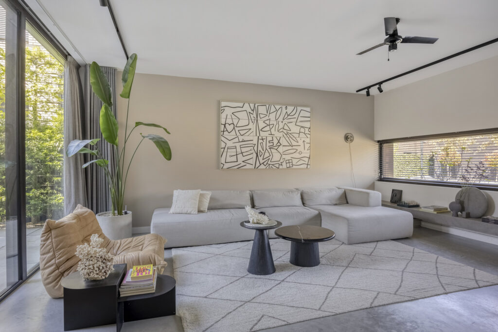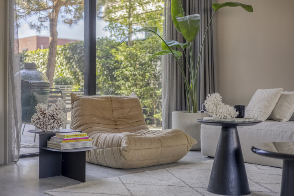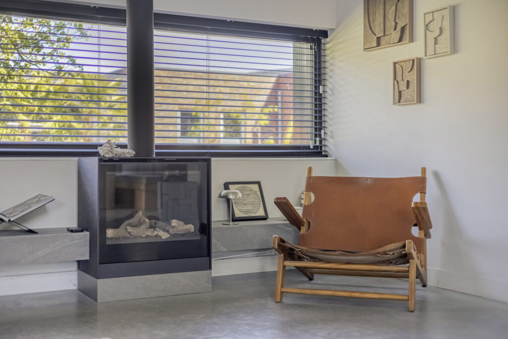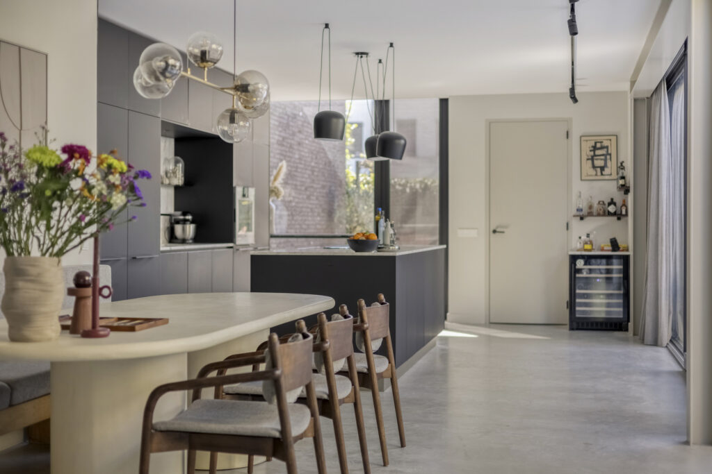 De gietvloer met vloerverwarming zorgt voor een moderne uitstraling en veel wooncomfort. Dankzij de grote raampartijen heb je een mooie verbinding met buiten en veel lichtinval.