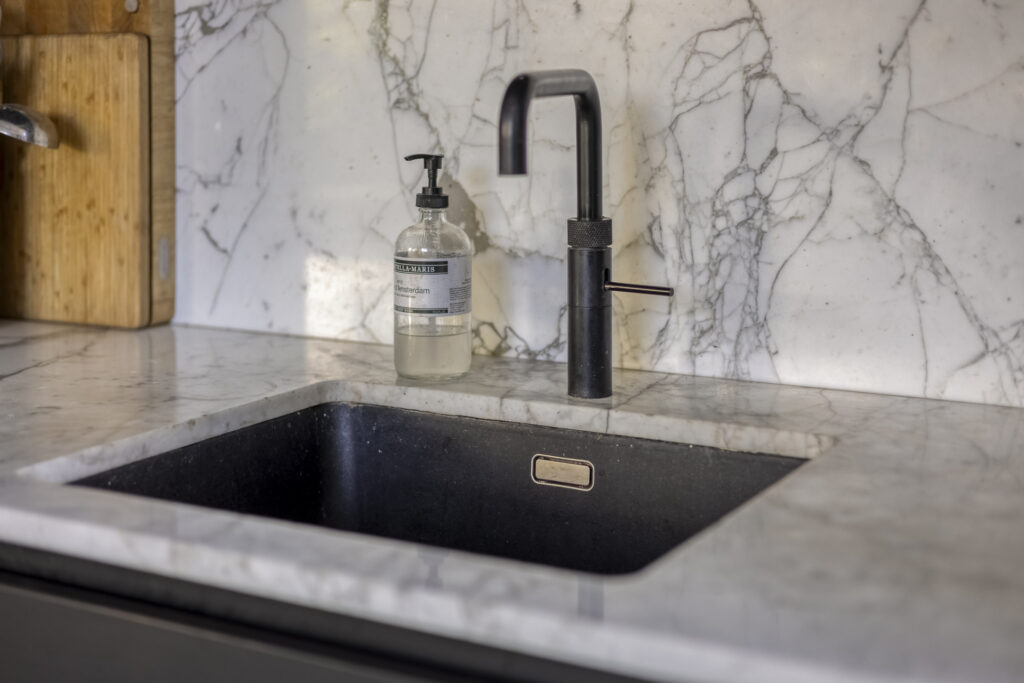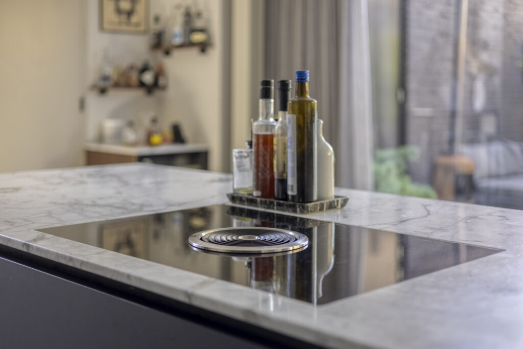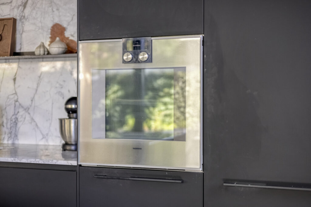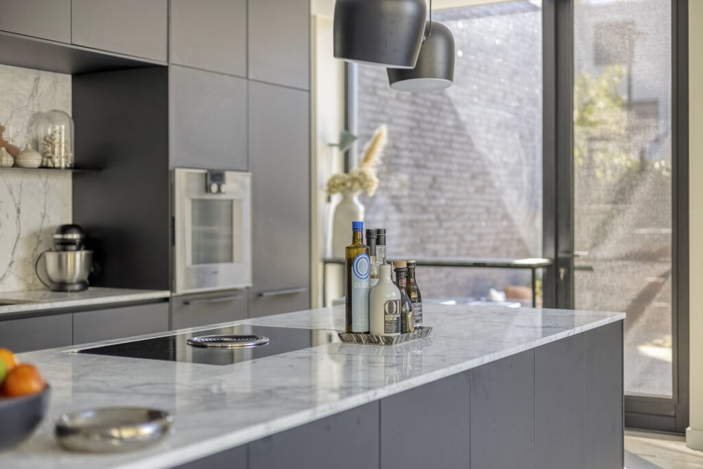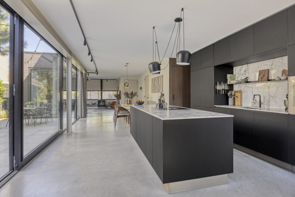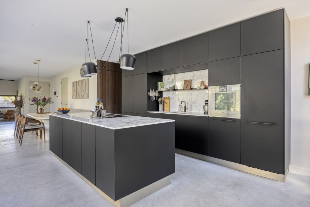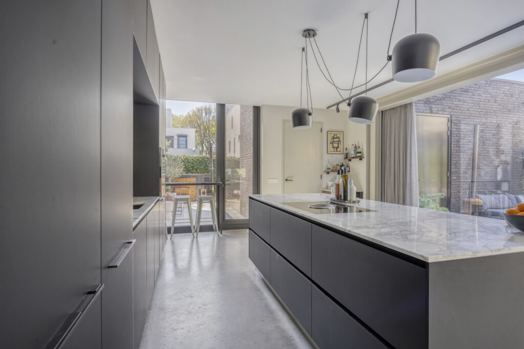 De luxe open keuken met een kookeiland vormt het hart van de woning. Hier is gekozen voor kwaliteit en comfort, met onder andere een Bora kookplaat, Gaggenau oven en Quooker. Alles is strak afgewerkt en er is volop bergruimte.