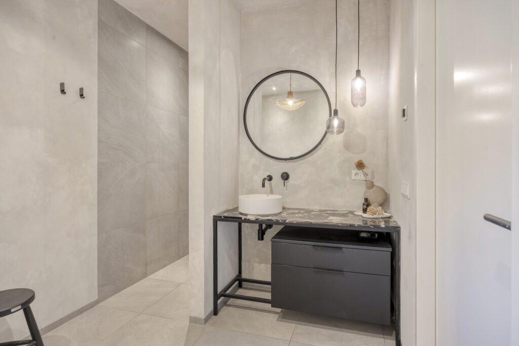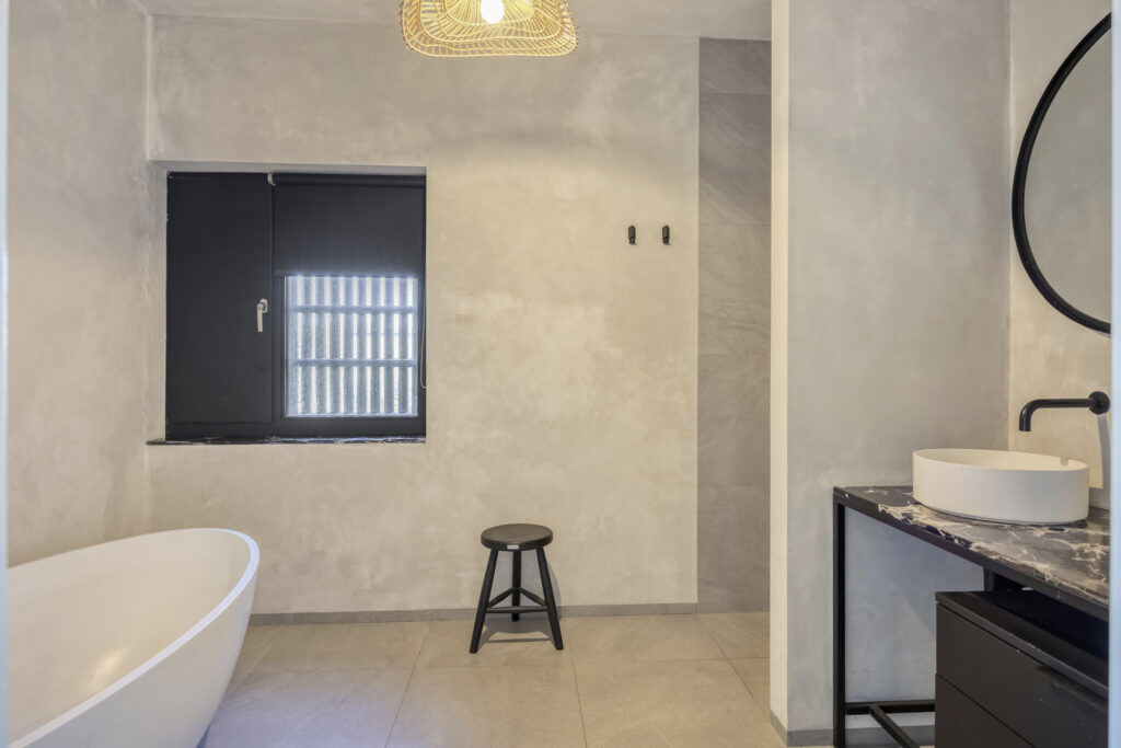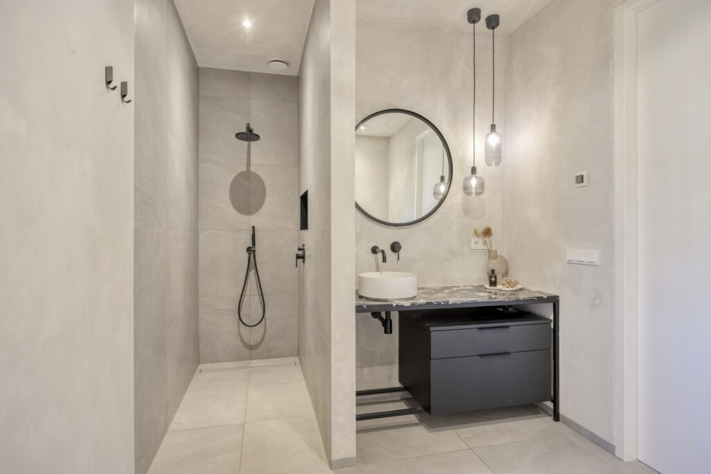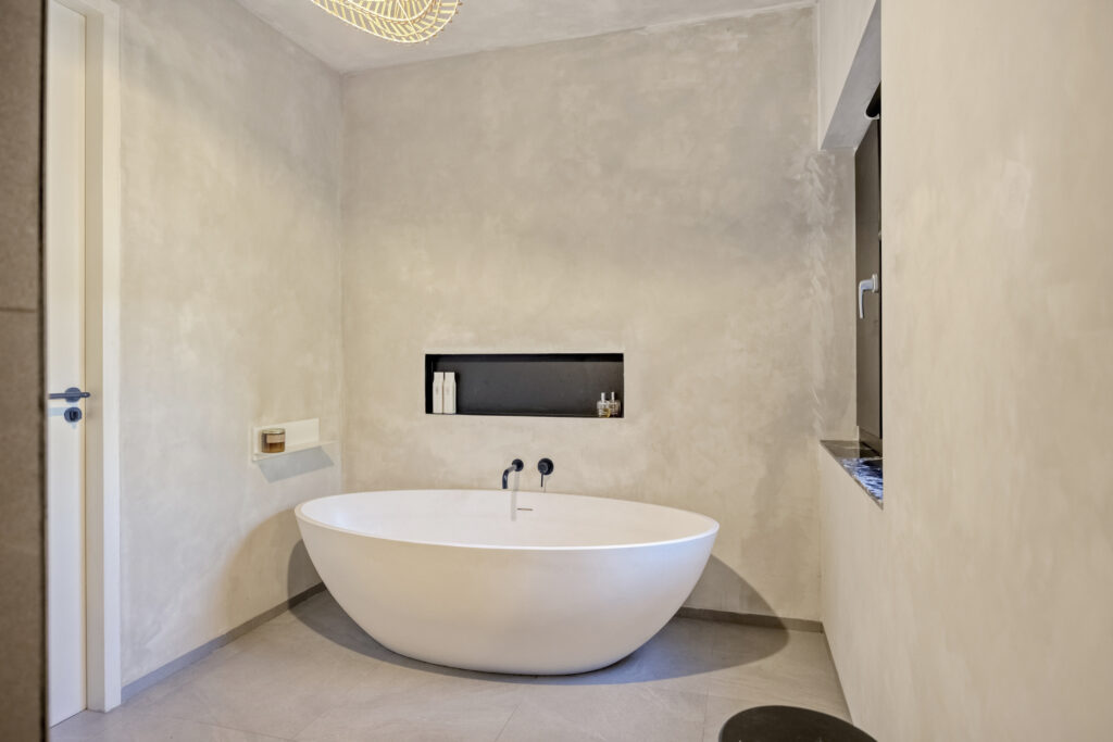De badkamer is luxe uitgevoerd met een vrijstaand bad, inloopdouche en een wastafelmeubel. Alles netjes afgewerkt en direct te gebruiken. De toiletruimte is separaat.