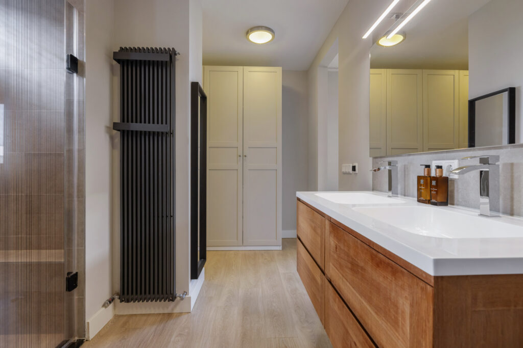 De tweede badkamer is functioneel ingericht en voorzien van een inloopdouche en wastafel. Direct naast de badkamer bevindt zich een apart toilet met wastafel.