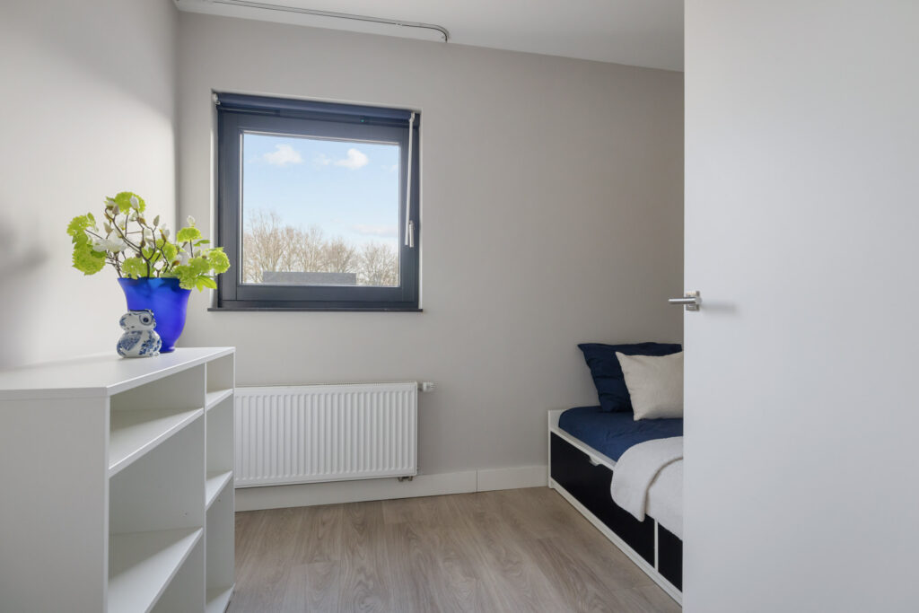 De tweede slaapkamer, gelegen aan de zijkant van de woning, is eveneens ruim en licht door de aanwezige grote ramen.