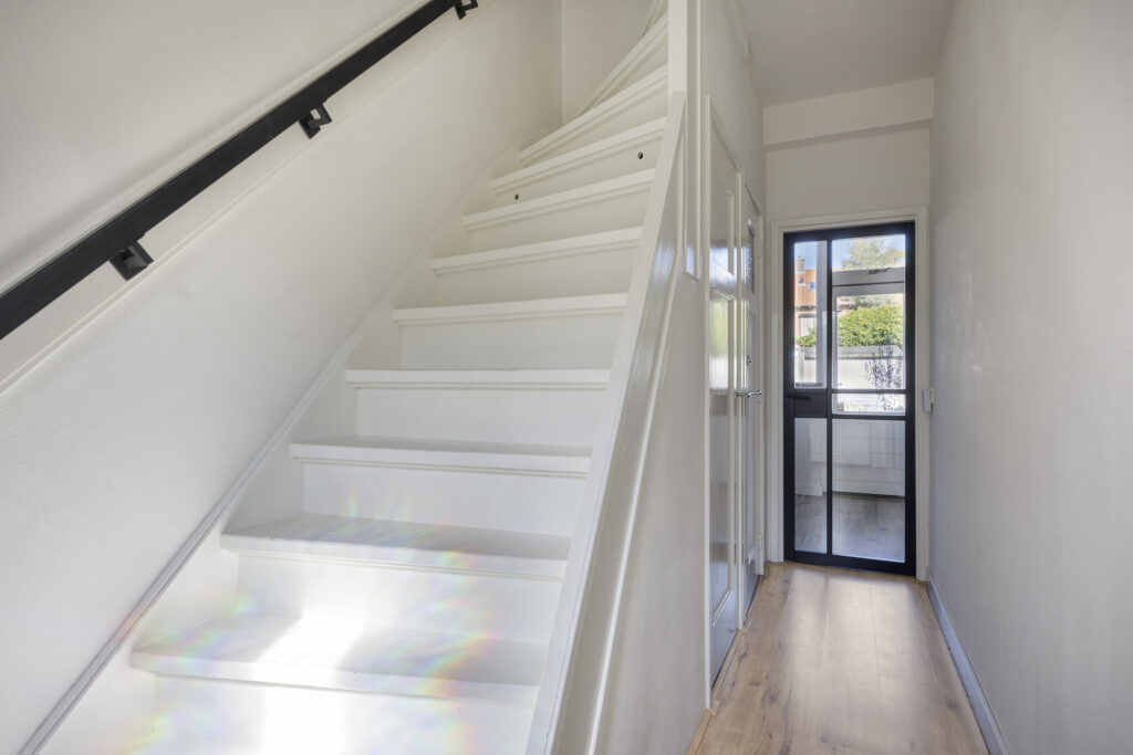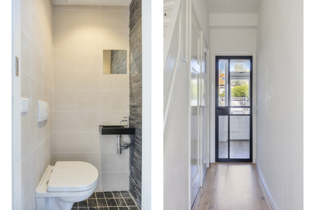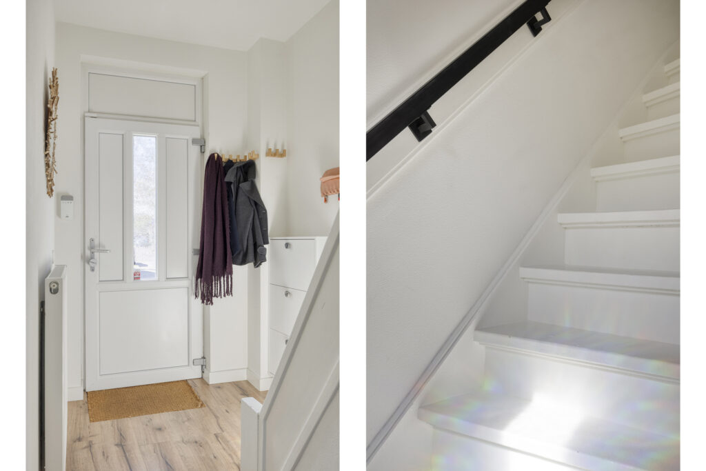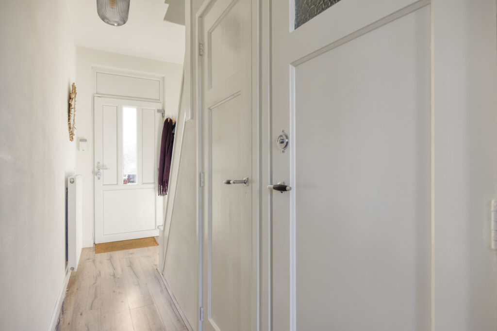 Via de aangelegde voortuin is de entree te bereiken. In de hal bevinden zich de trapopgang naar de eerste verdieping, een praktische trapkast en de luxe betegelde toiletruimte met een wandcloset en fonteintje. Een trendy zwarte taatsdeur biedt toegang tot de woonkamer.