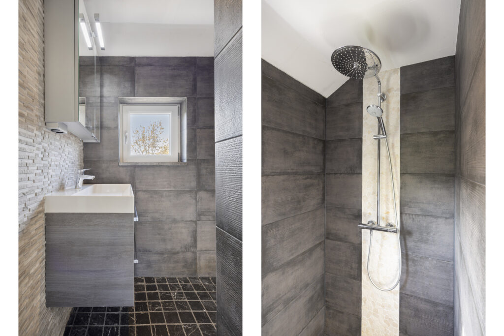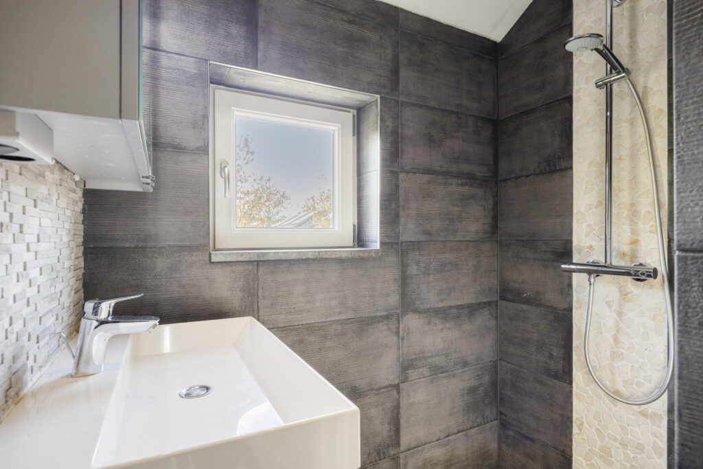 De volledig betegelde badkamer is uitgerust met een ruime inloopdouche met een thermostaatkraan, regendouche en handdouche, een wastafelmeubel en een spiegelkast. Het geheel is luxe betegeld en ook hier is een kunststof kozijn met HR++ beglazing aanwezig.