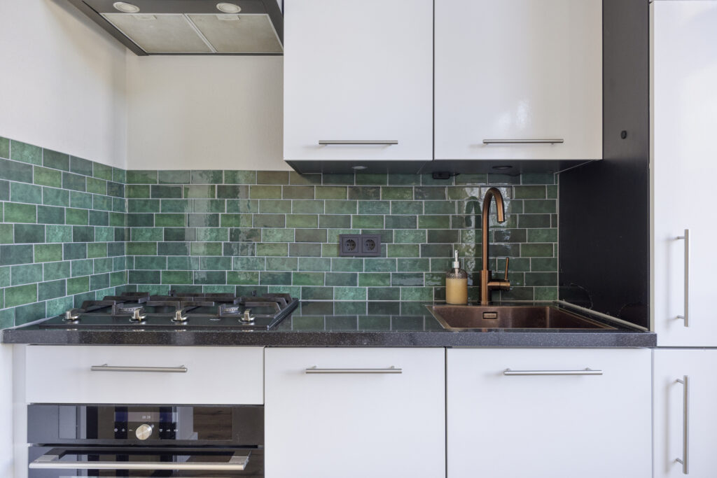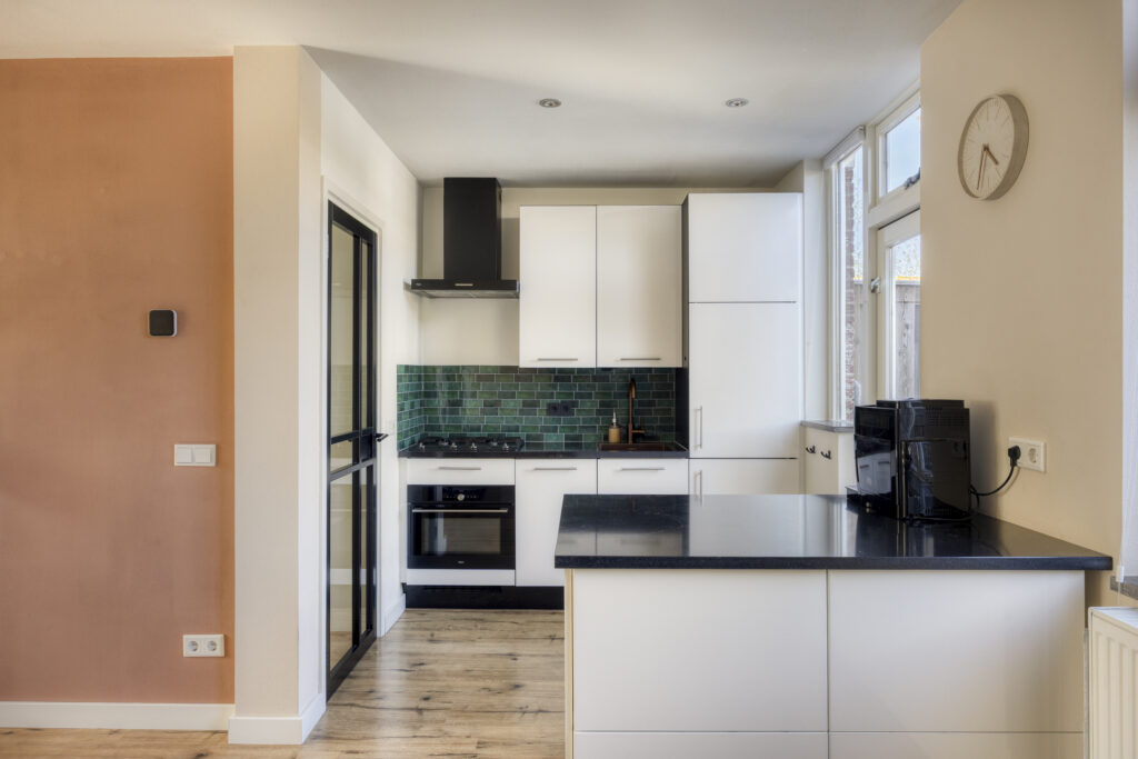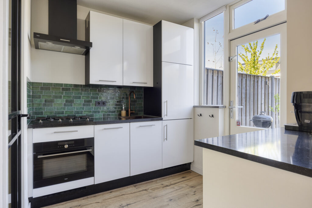 De open keuken is aan de achterzijde gesitueerd en is voorzien van een lichte en moderne keukeninrichting met een stenen aanrechtblad, spoelbak, 4-pits gaskookplaat, afzuigkap, combi-oven, vaatwasser, koelkast en een vriezer. De diverse boven- en onderkasten, waaronder een bergeiland met een wasmachineaansluiting, bieden voldoende bergruimte en een deur biedt toegang tot de achtertuin. Ook hier zijn dimbare inbouwspots aanwezig.