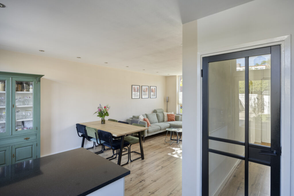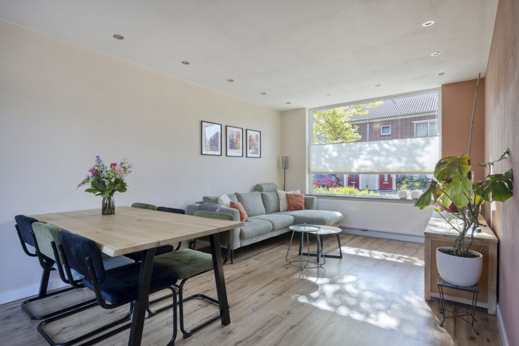 De fijne en lichte woonkamer is voorzien van een mooie laminaatvloer, welke doorloopt in de hal en de keuken. De woonkamer is ruimer dat je zult vermoeden en geniet volop lichtinval door de grote raampartijen aan de voorzijde en achterzijde. Tevens is het plafond volledig voorzien van dimbare inbouwspots.