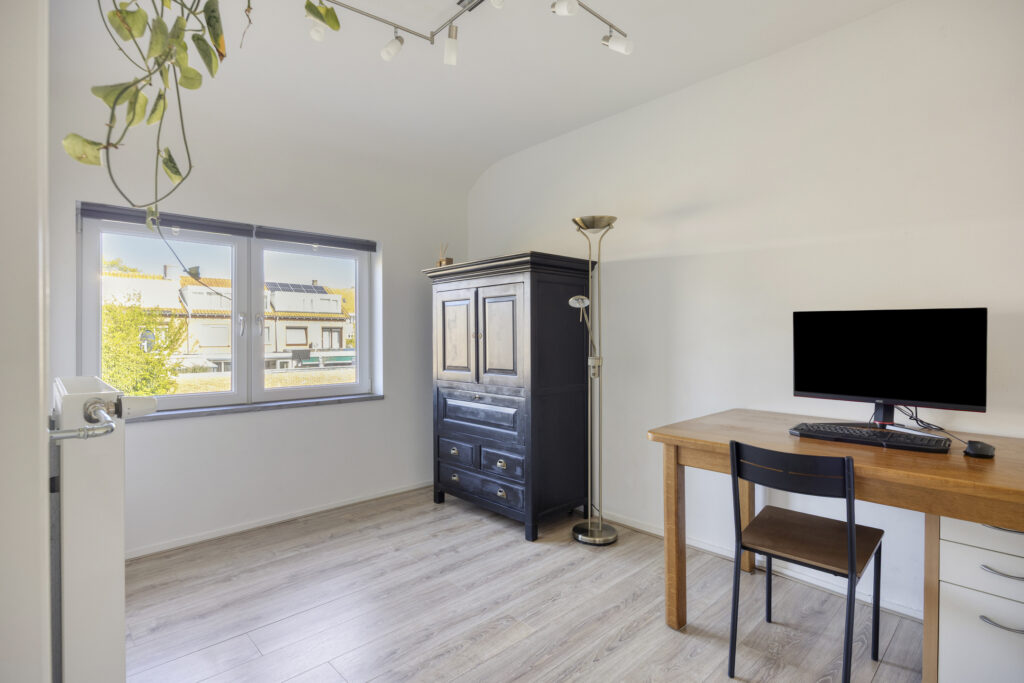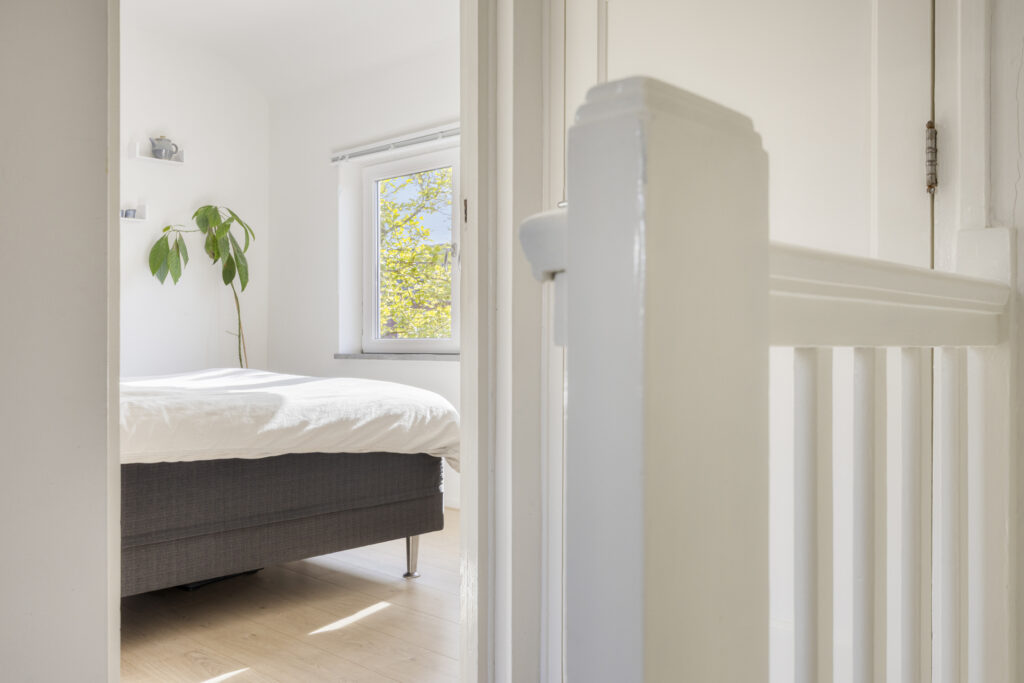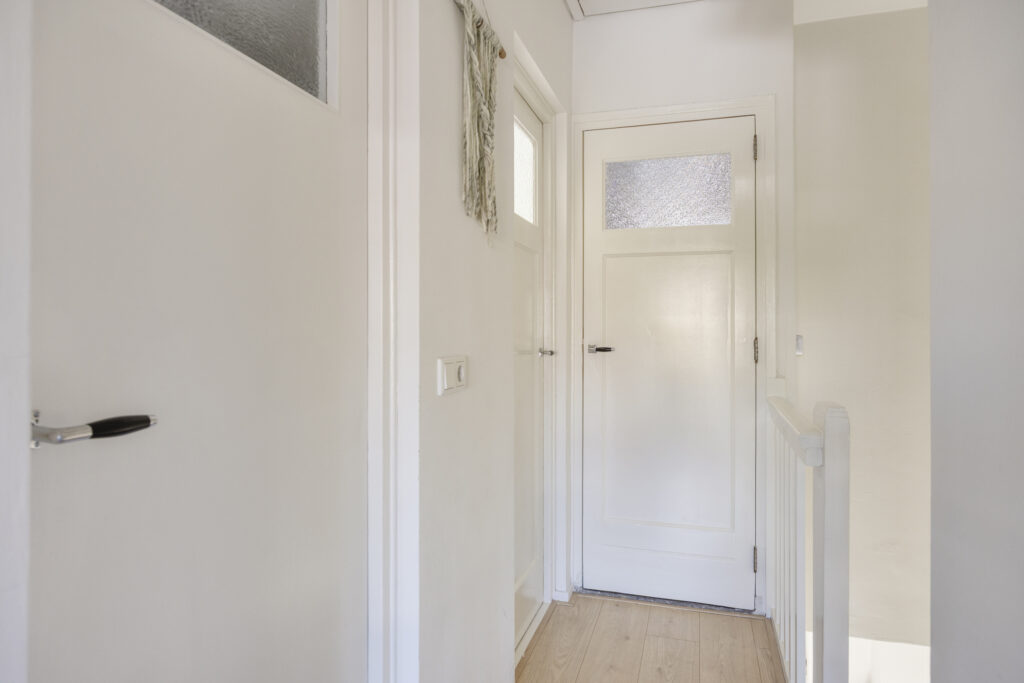 De overloop biedt toegang tot drie slaapkamers en de badkamer. Zowel de overloop als de slaapkamers zijn voorzien van een nette laminaatvloer.
