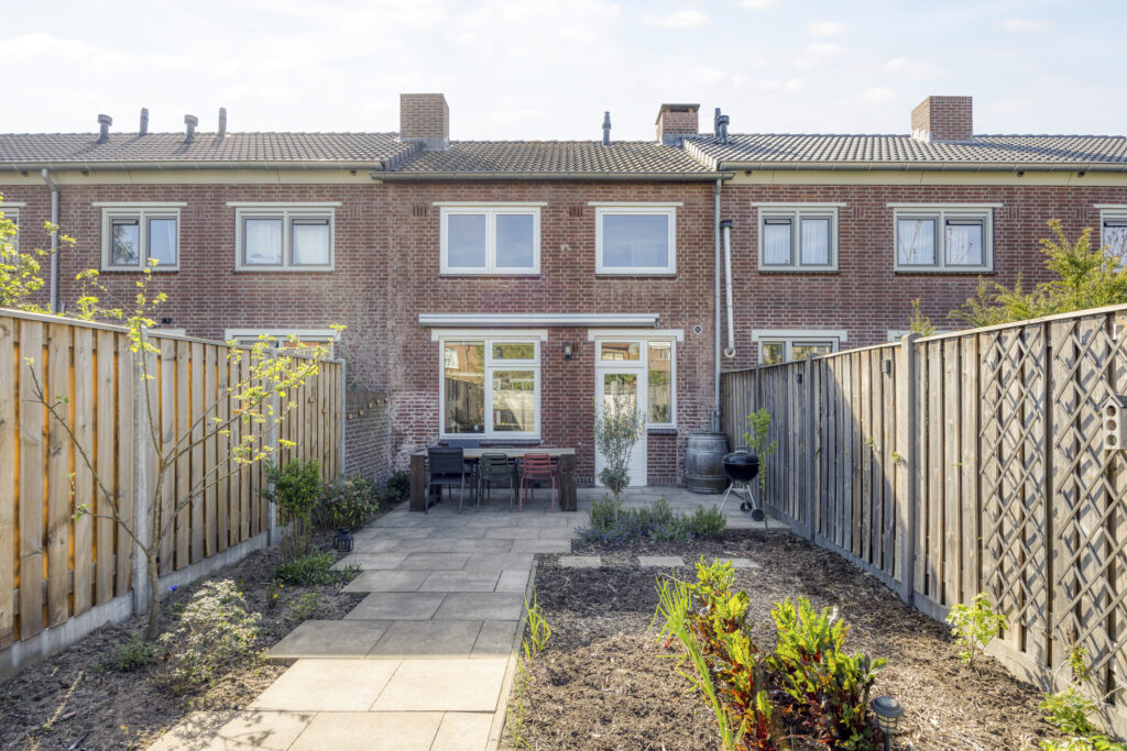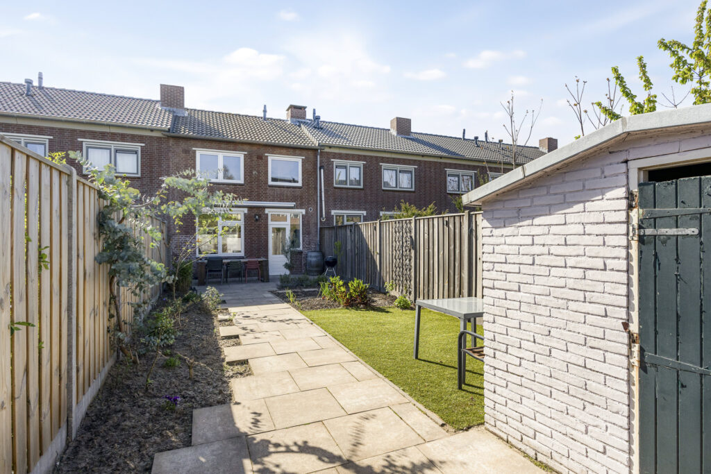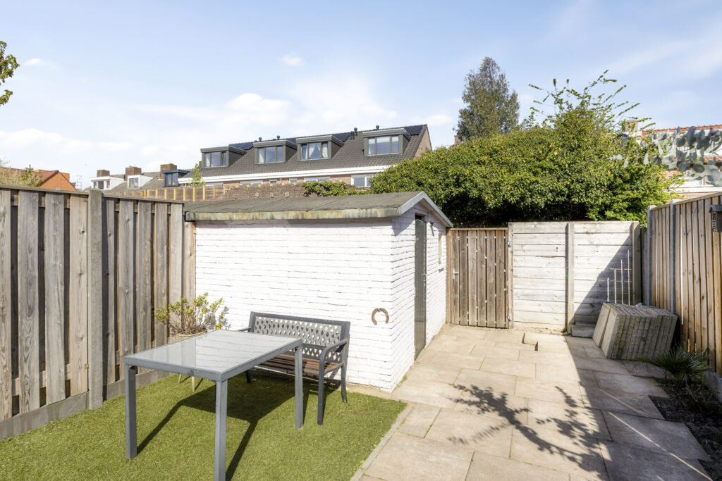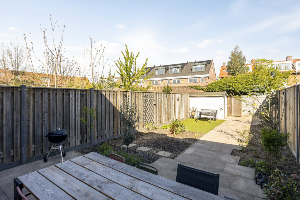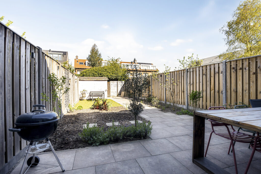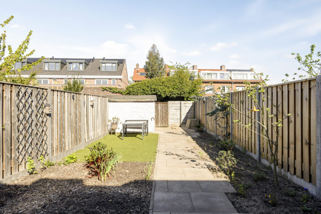 De diepe achtertuin, gelegen op het oosten, is verzorgd aangelegd met moderne tuintegels, een fijn terras met een zonneluifel, plantenborders met vaste beplanting en kunstgras. Achterin de tuin zijn de stenen berging en de eigen achterom gelegen.