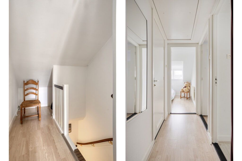 De overloop biedt toegang tot drie slaapkamers en de badkamer. Zowel de overloop als de slaapkamers zijn voorzien van een nette laminaatvloer.