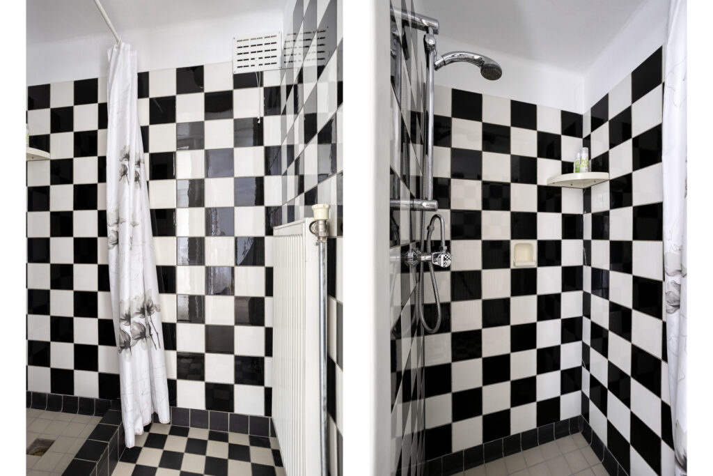 De badkamer is volledig betegeld en is uitgerust met een inloopdouche.