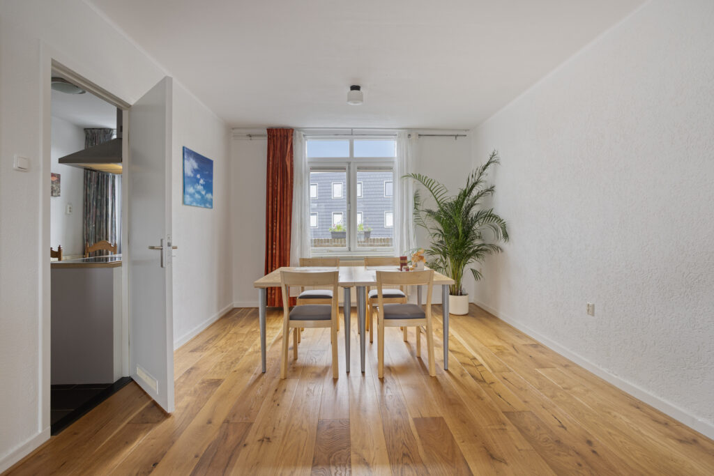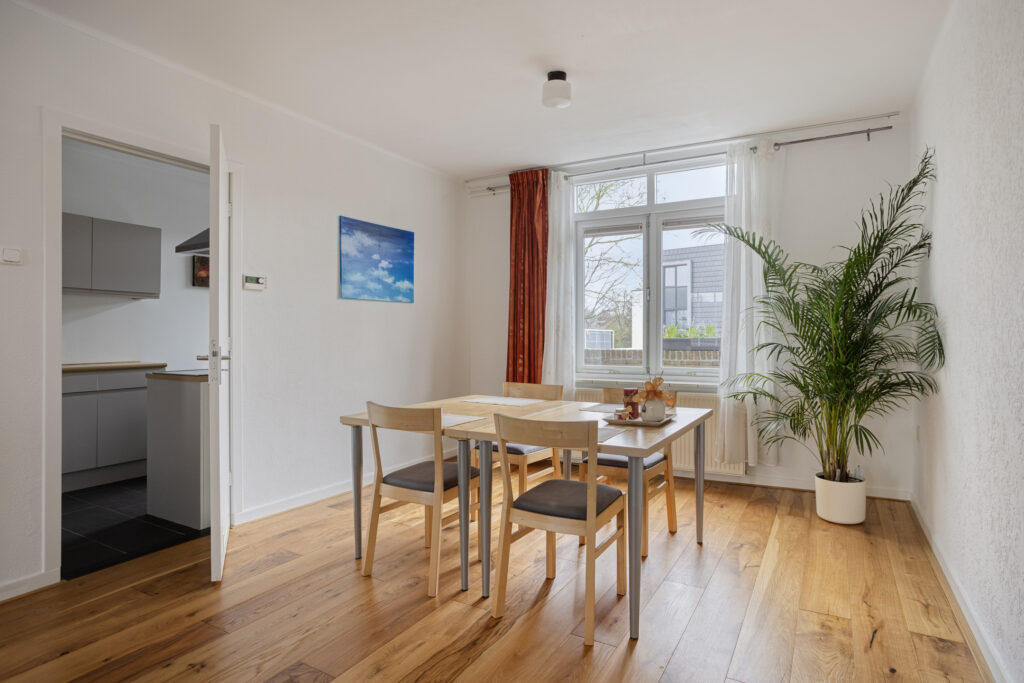 De ruime doorzonwoonkamer heeft een oppervlakte van circa 32,5 m² en is voorzien van een zeer nette parketvloer met hoge witte plinten, gelegd in 2024. Het is een fijne en lichte verblijfsruimte met grote raampartijen aan de voor- en achterzijde.