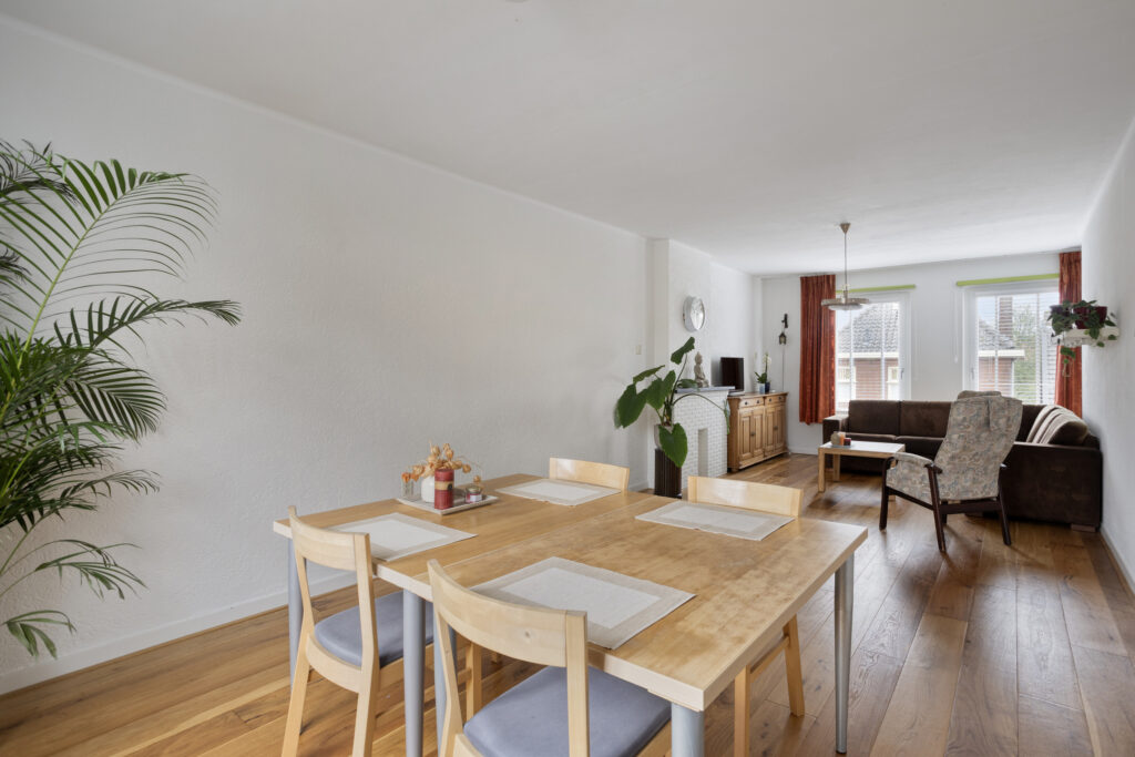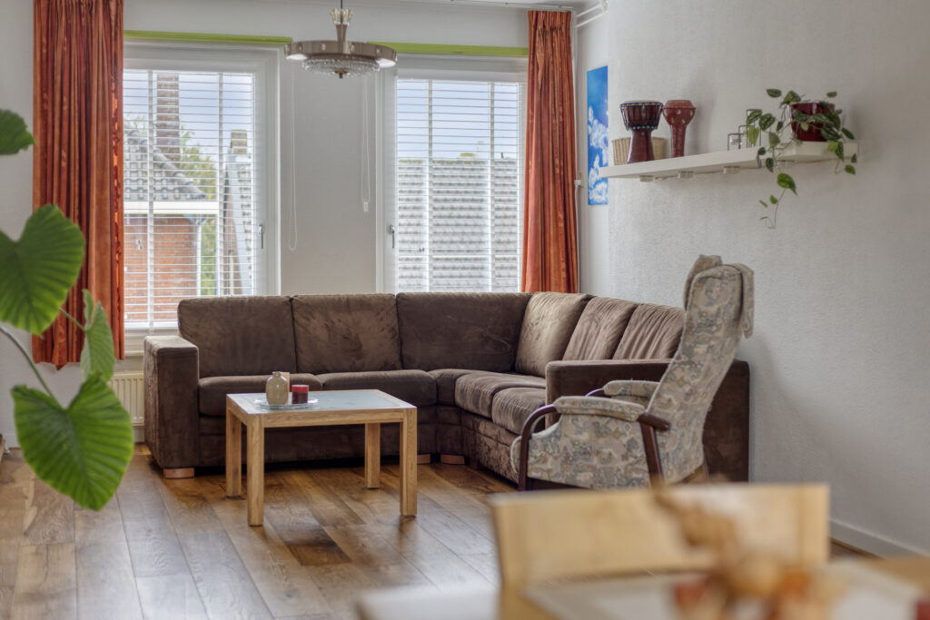 – In 2024 is de nette parketvloer met hoge witte plinten in de woonkamer gelegd.