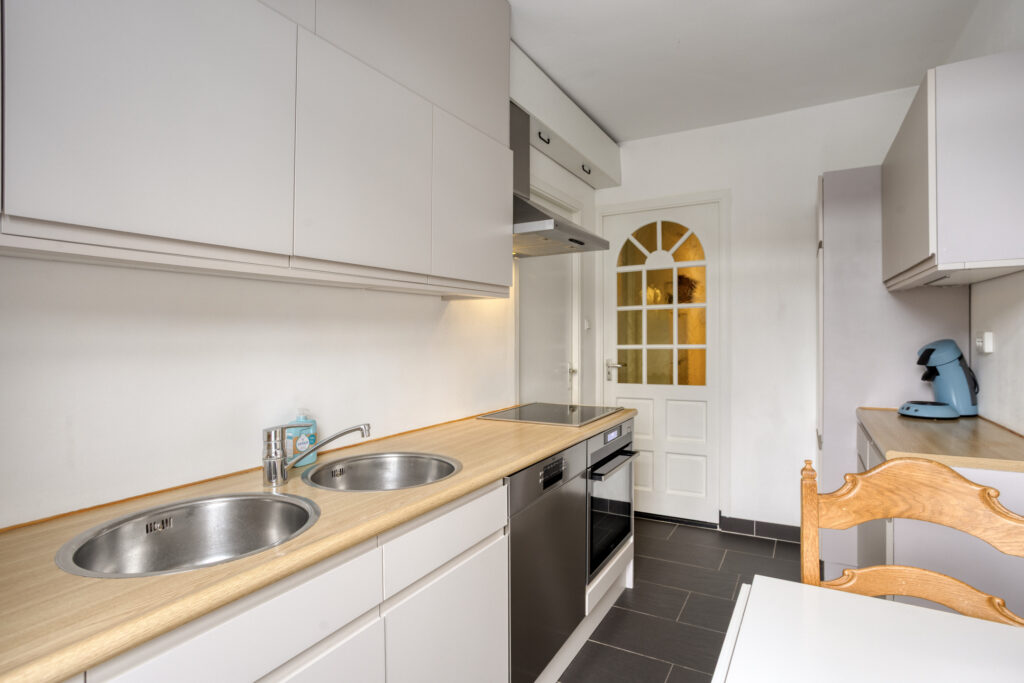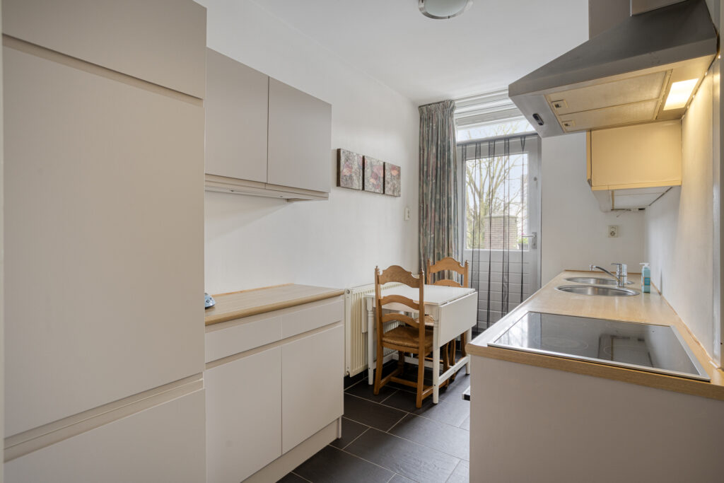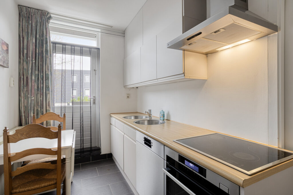 De keukeninrichting is recent deels gerenoveerd en is voorzien van nieuwe keukenfrontjes. Verder bestaat de inrichting uit twee opstellingen met een dubbele spoelbak, keramische kookplaat, afzuigkap, combi-stoomoven, vaatwasser, koelkast en volop bergruimte. Op de vloer ligt een trendy antraciet tegelvloer.