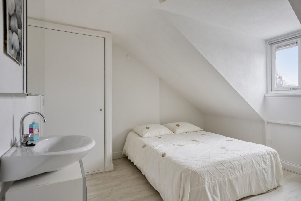 Slaapkamer 2 (circa 10 m²) is aan de voorzijde gelegen en is voorzien van een wastafel, een vaste kast en een dakkapel.