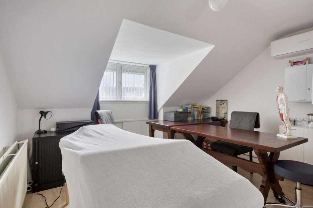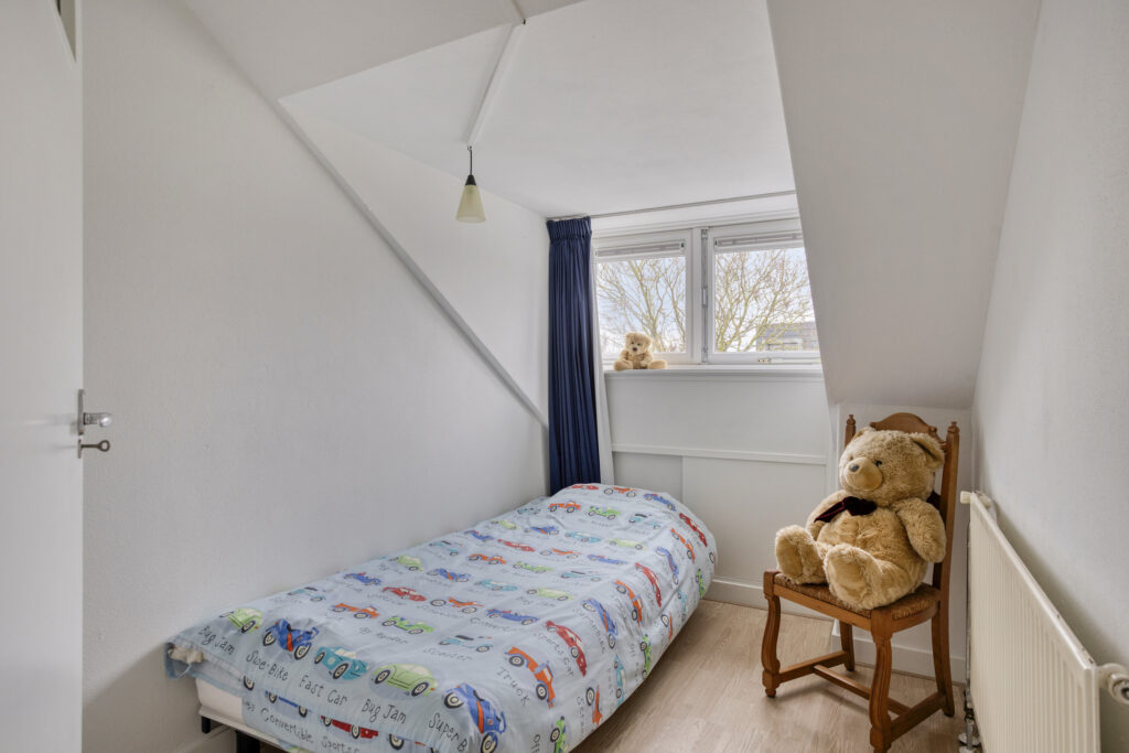 Slaapkamer 3 (circa 5 m²) is aan de achterzijde gelegen en is voorzien van een vaste kast en een dakkapel.