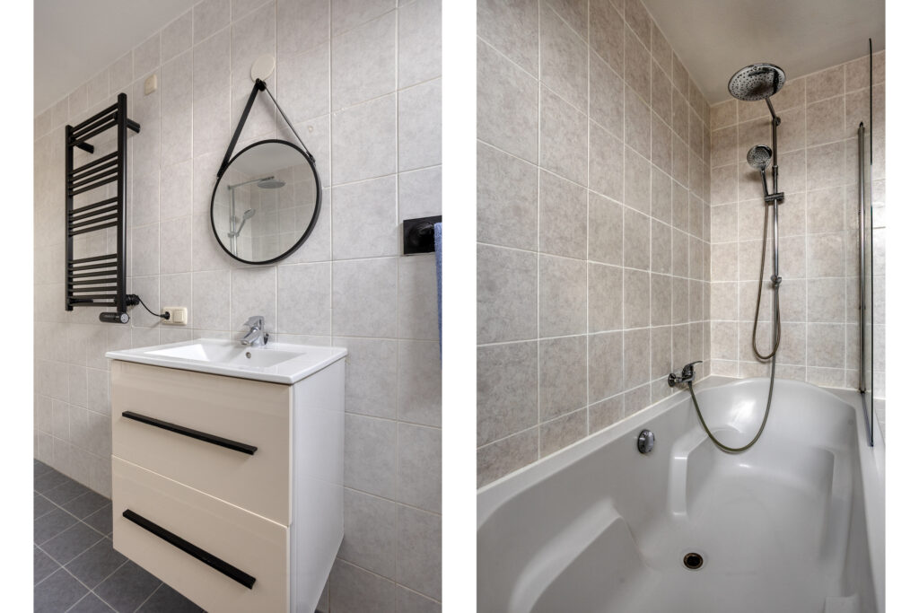 De volledig betegelde en moderne badkamer is uitgerust met een ligbad met douchegelegenheid, een closet, een wastafelmeubel en een designradiator.